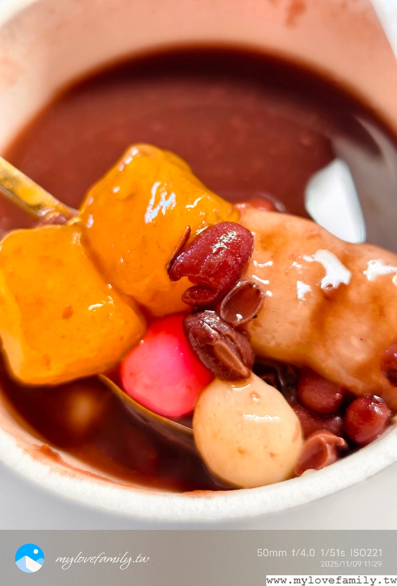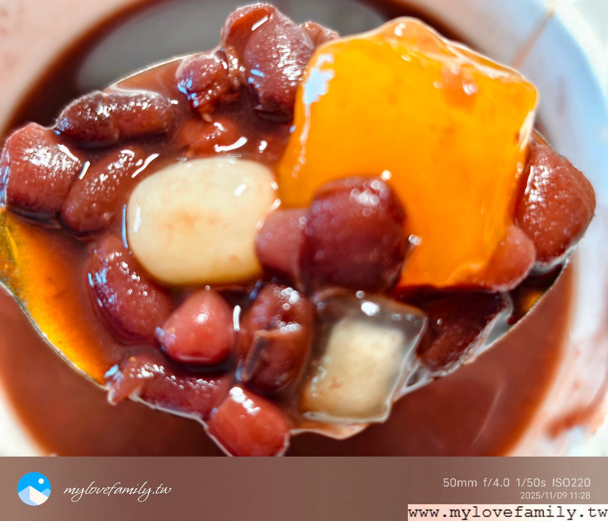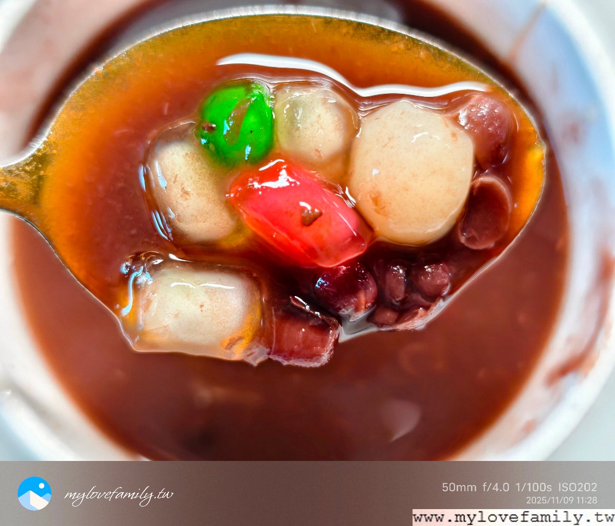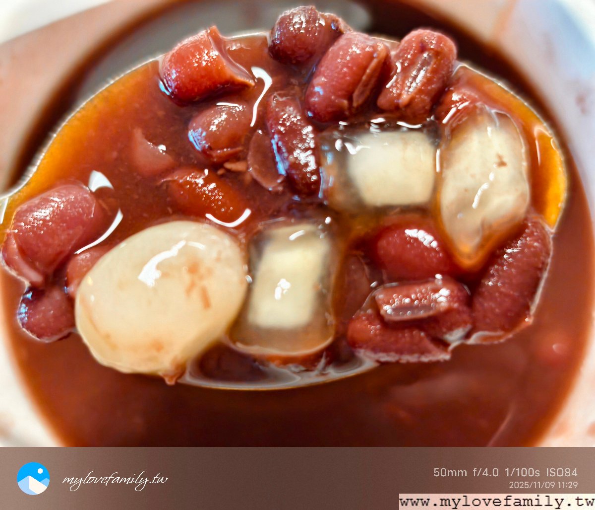 而紅豆湯的部份,加了湯圓、芋圓、地瓜圓,料不少喔!或許因為原本沒有期待,反而覺得這的紅豆湯很厲害,可以說是被豬血糕擔誤的紅豆湯,紅豆湯的口感很古早味,有點沙沙口感卻又有飽滿的紅豆,這一杯我喜歡。
