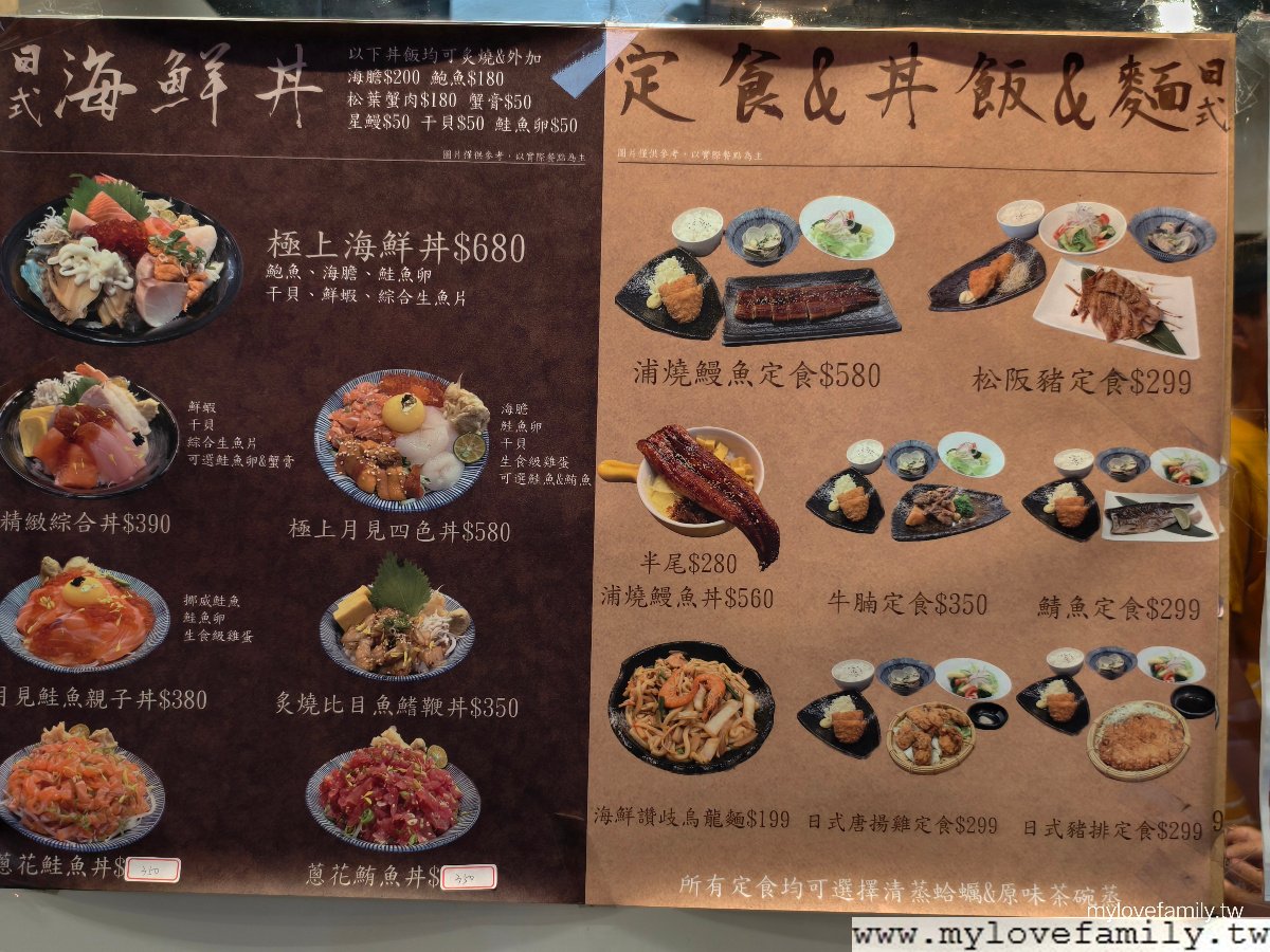牆面上著丼飯、定食、麵的介紹,定食的價位從$299元起,含和風沙拉、湯品或茶碗蒸、白飯、小菜、炸物及鮭魚味噌湯、熱麥茶無限供應。
