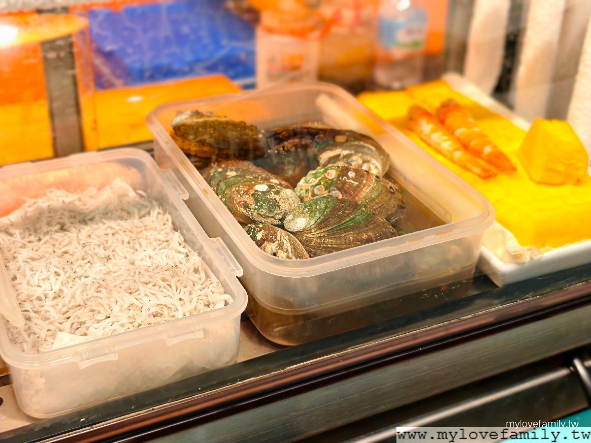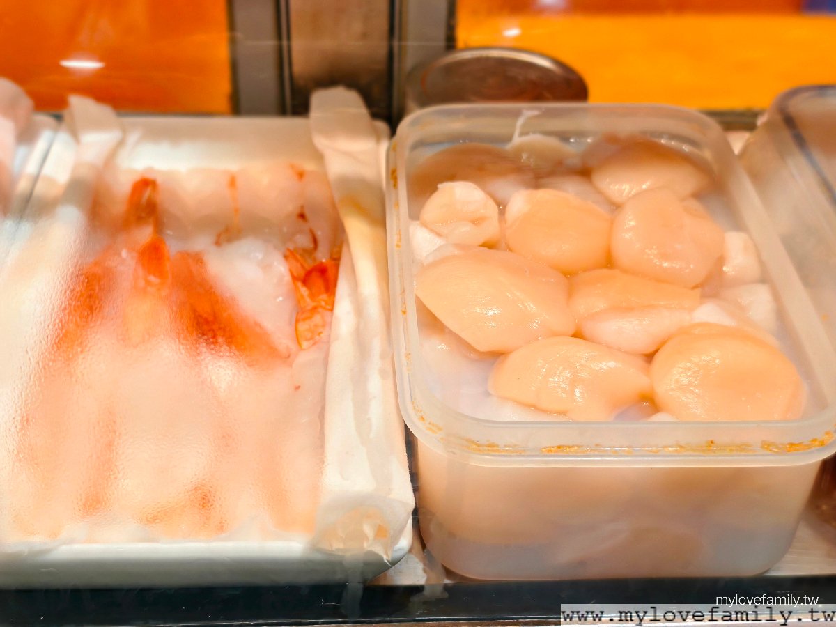 料理台上的新鮮海鮮,干貝看起來好大一顆。
