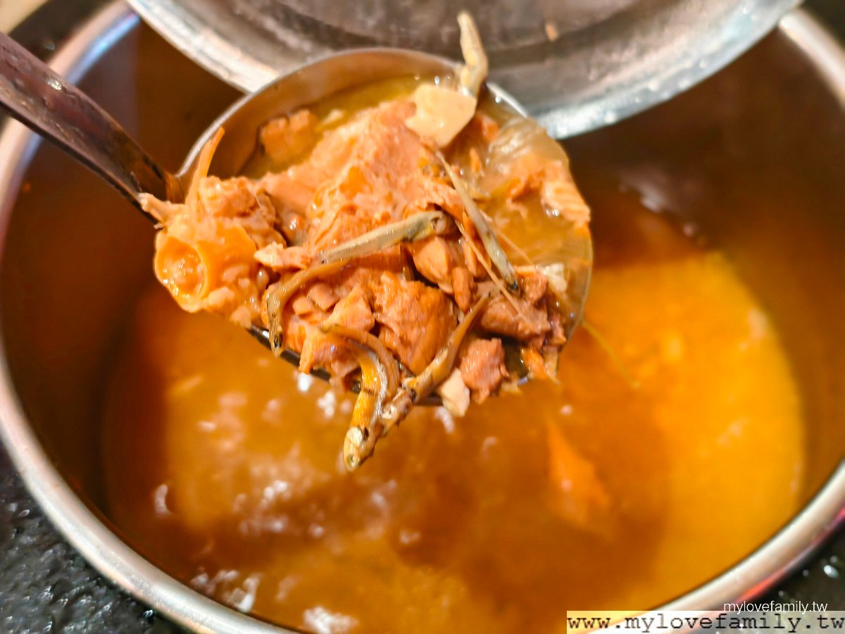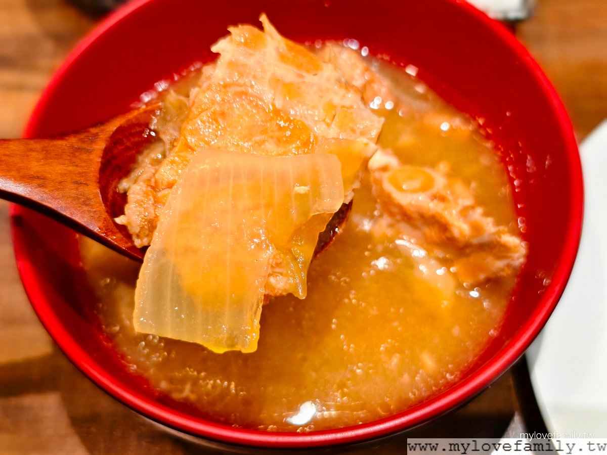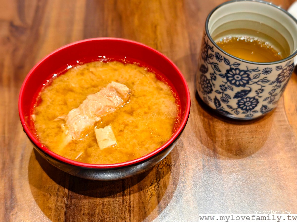 鮭魚味噌湯真的下重本的,應該是把拿來切生魚片後,所剩下的角邊肉及魚骨拿來煮湯,這湯頭好鮮甜,不過在喝的時候,要很小心魚刺,一般鮭魚的魚刺算很容易就看到,但還是有部份小魚刺在湯底,喝的時候要特別注意。