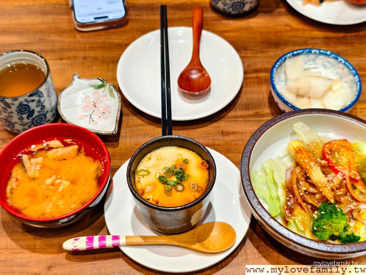 我的松阪豬定食,和風沙拉的份量也很有誠意,蒸蛋內的料也不少,以定食來說,【友良小家料理】的定完全是物超所值。這鮭魚味噌湯可以打敗不少店家