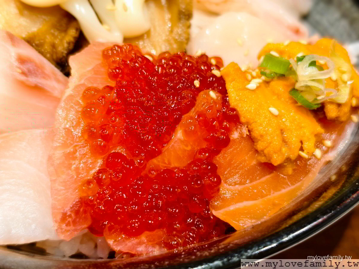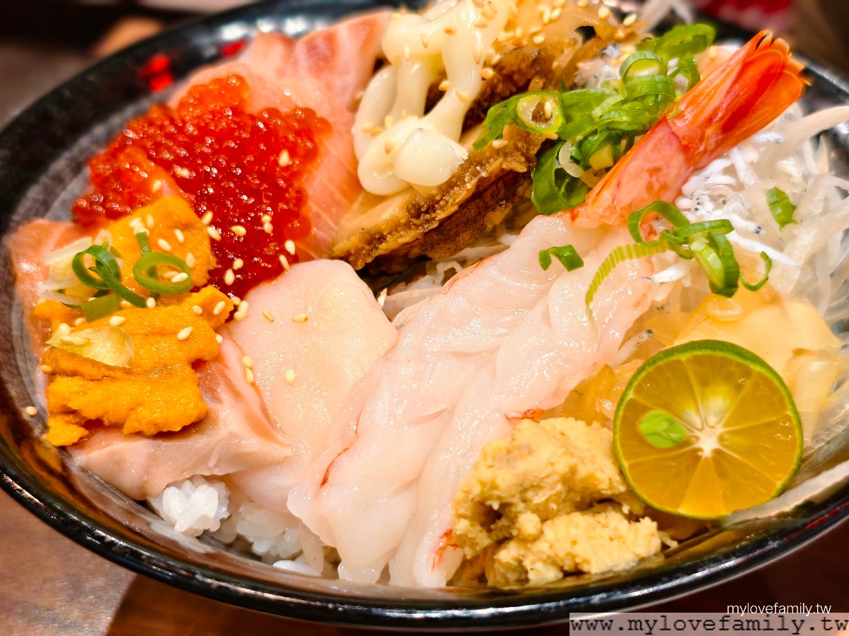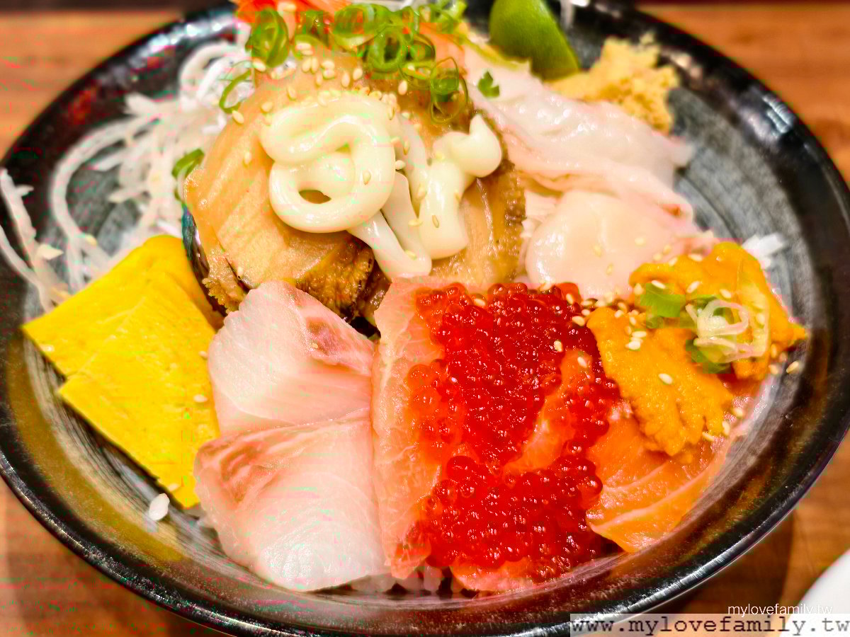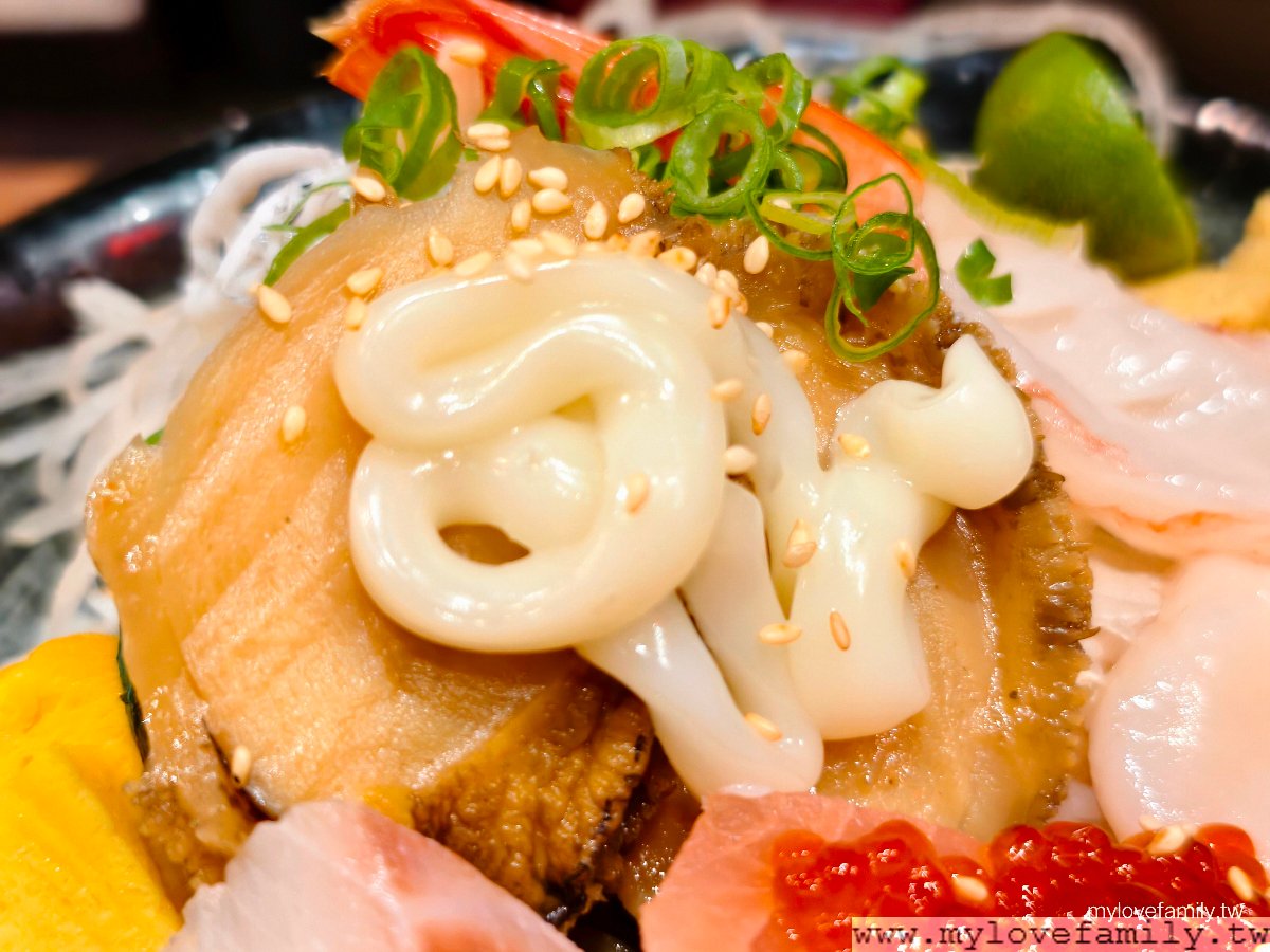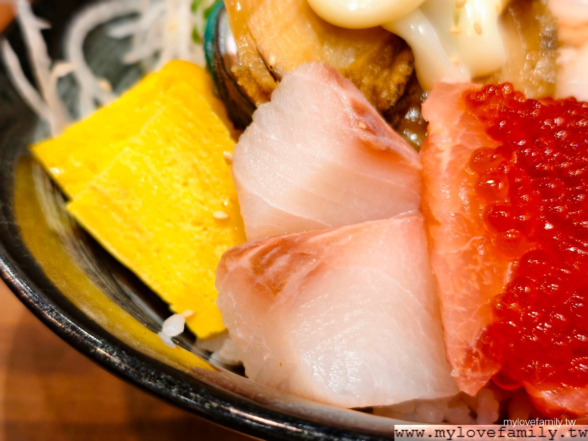 極上海鮮丼,鮑魚、蝦、干貝、海膽、 鮭魚卵、玉子燒…..,好豐盛的海鮮丼,食量大的人還可以選擇加飯喔!