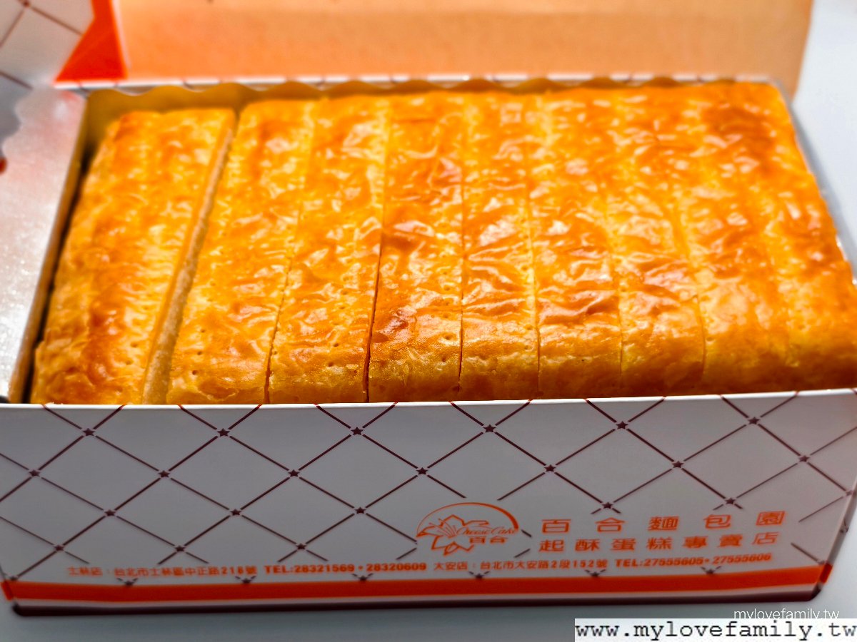這的起酥蛋糕酥皮厚實層次感多,而另一家位在大同區,離我娘家很近的知名起酥蛋糕【加福奇士蛋糕專門店】相較之下,我個人比較喜歡【百合麵包園】的起酥蛋糕。