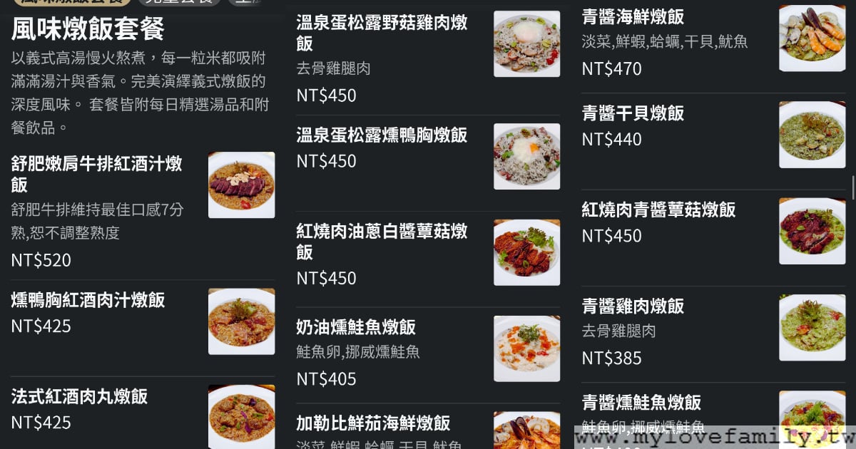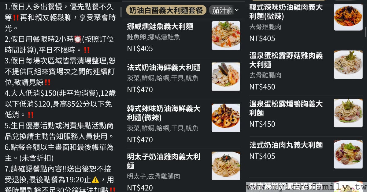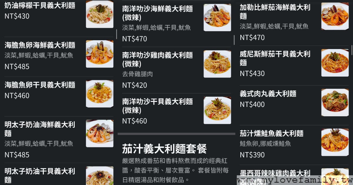 附上部份餐點給大家參考, 消費標準:每人低消為 $150,12 歲以下為 $120,多樣化的義大利麵套餐、燉飯、排餐、開胃菜、甜點、飲品,每一次來都要考慮很久,才能決定要吃些什麼,選擇性太多,反而更有選擇困難。假日用餐限時 2 小時(以訂位時間起算),平日無用餐時間限制,若遇客滿時,能會適時協助安排座位流動。