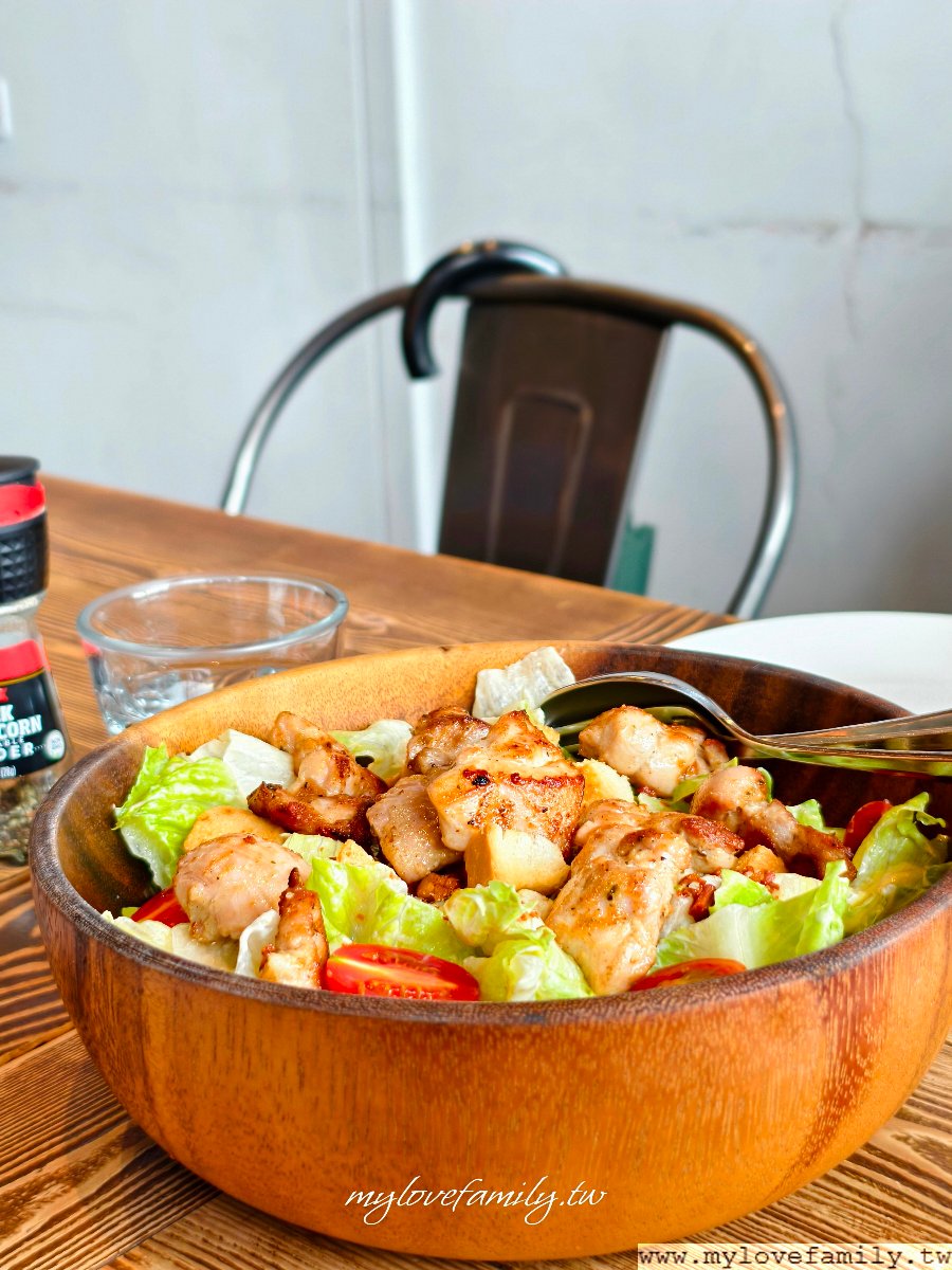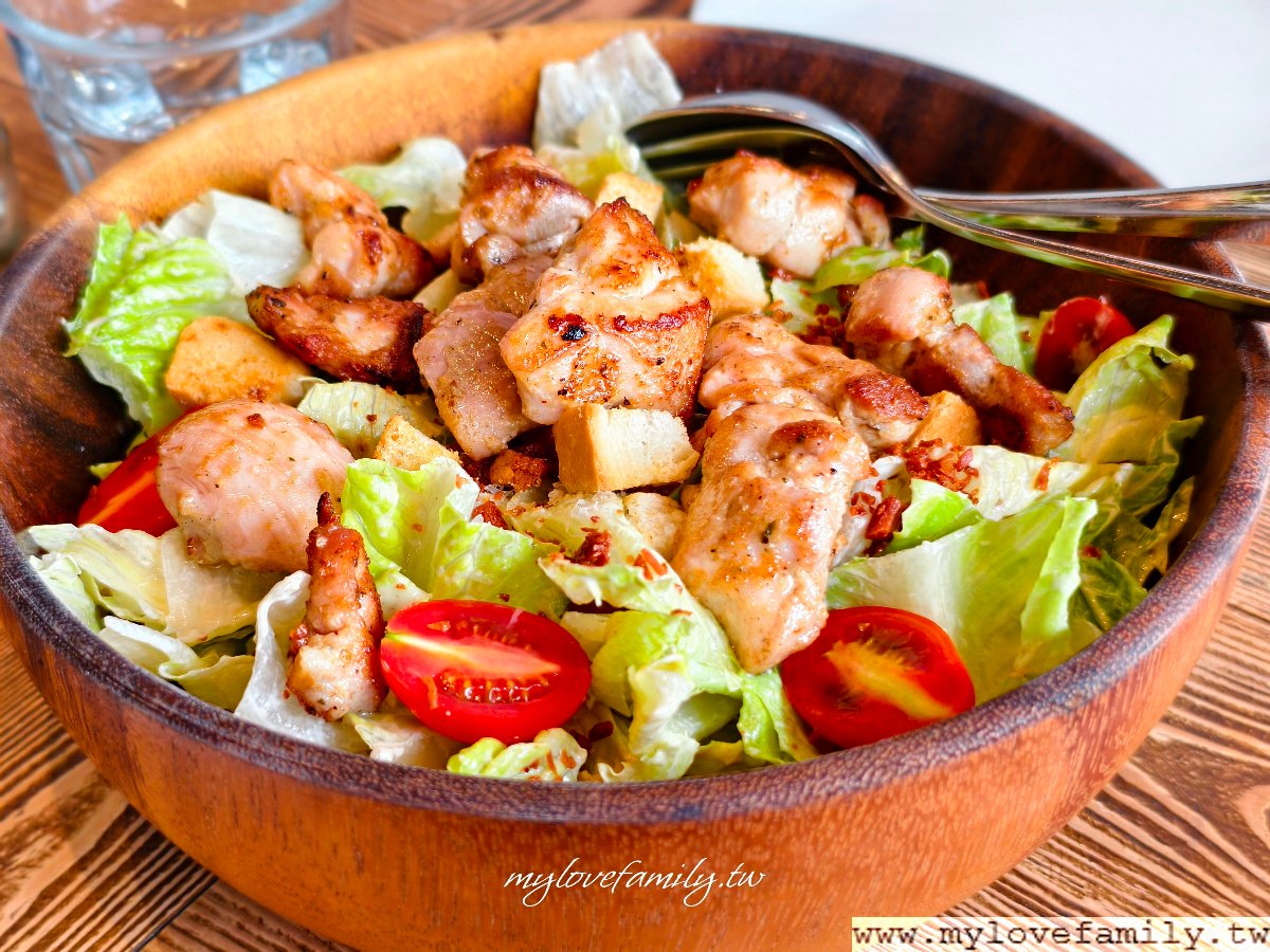 香料烤嫩雞凱薩沙拉,香料烤嫩雞料理的很到位,鮮嫩多汁又入味,這一份當然吃不完,打包一半回家。