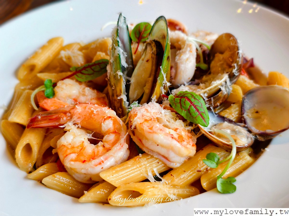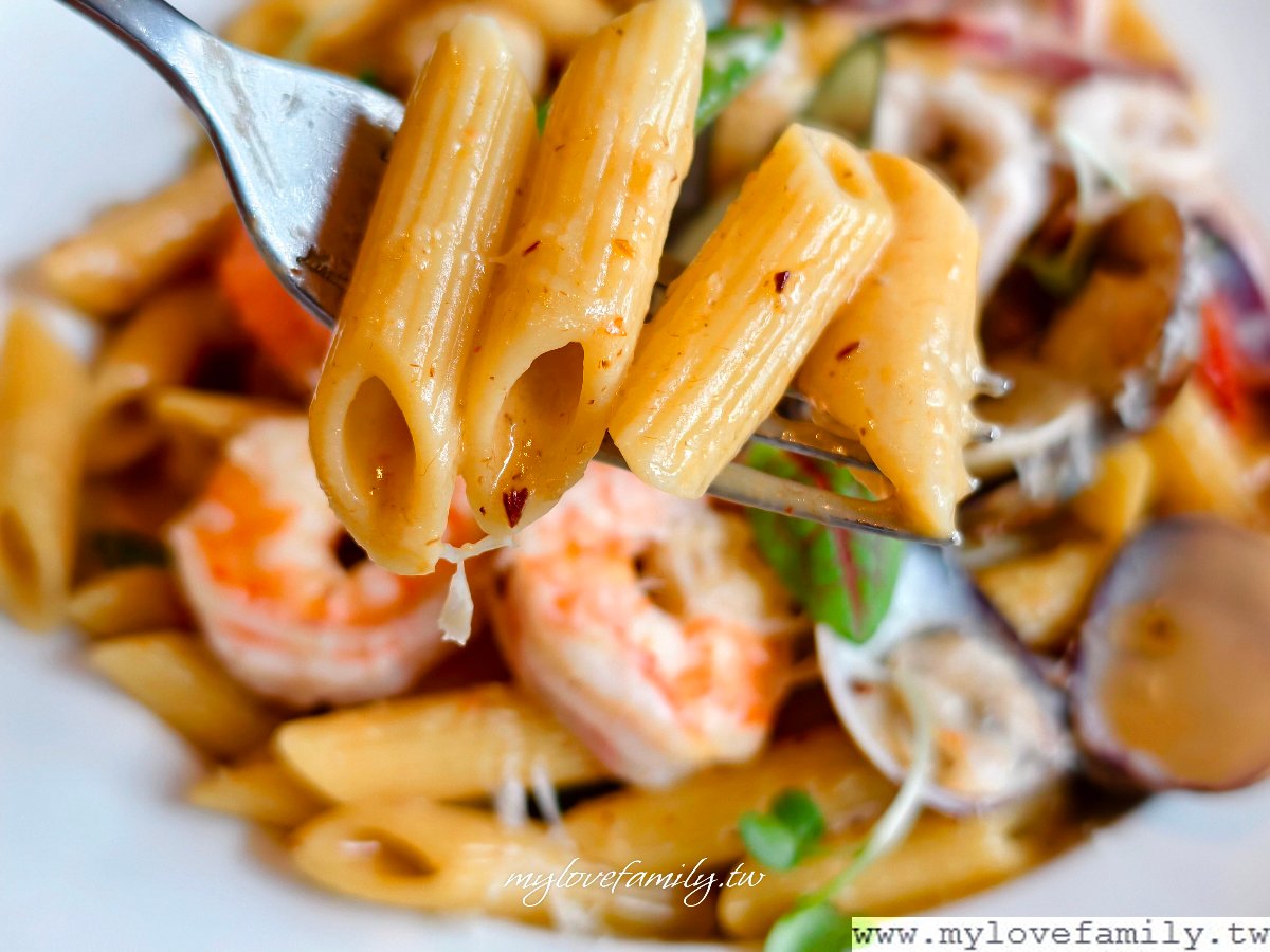 我的南洋叨沙海鮮筆管麵,濃郁的椰奶與叻沙醬香辣風味,辣度算是小辣的口感,這味道青少年也喜愛,加上新鮮海鮮的鮮甜,筆管麵有嚼勁Q彈的口感,麵吸滿了醬汁,相當入味,海鮮的份量也很有誠意喔!份量十足的南洋叨沙海鮮筆管麵,一樣打包了一半回家跟青少年分享。