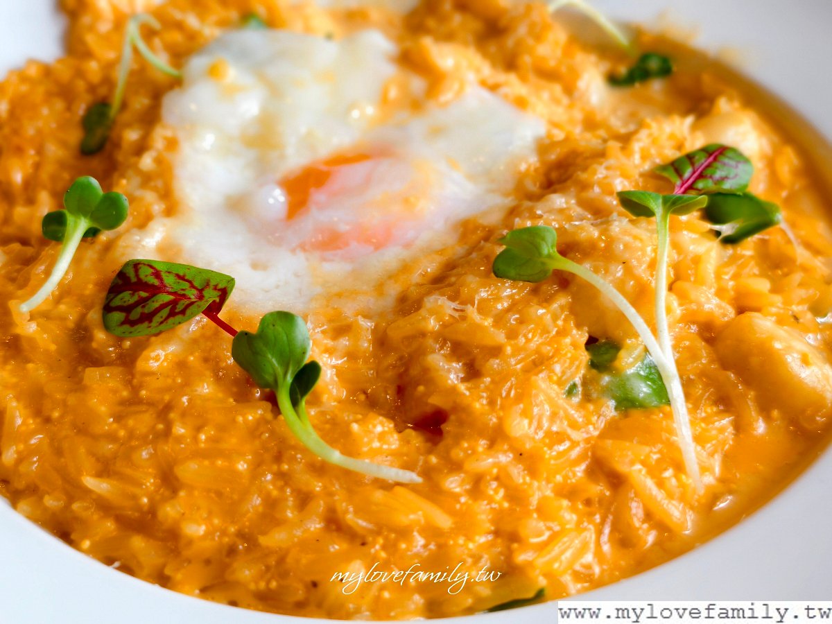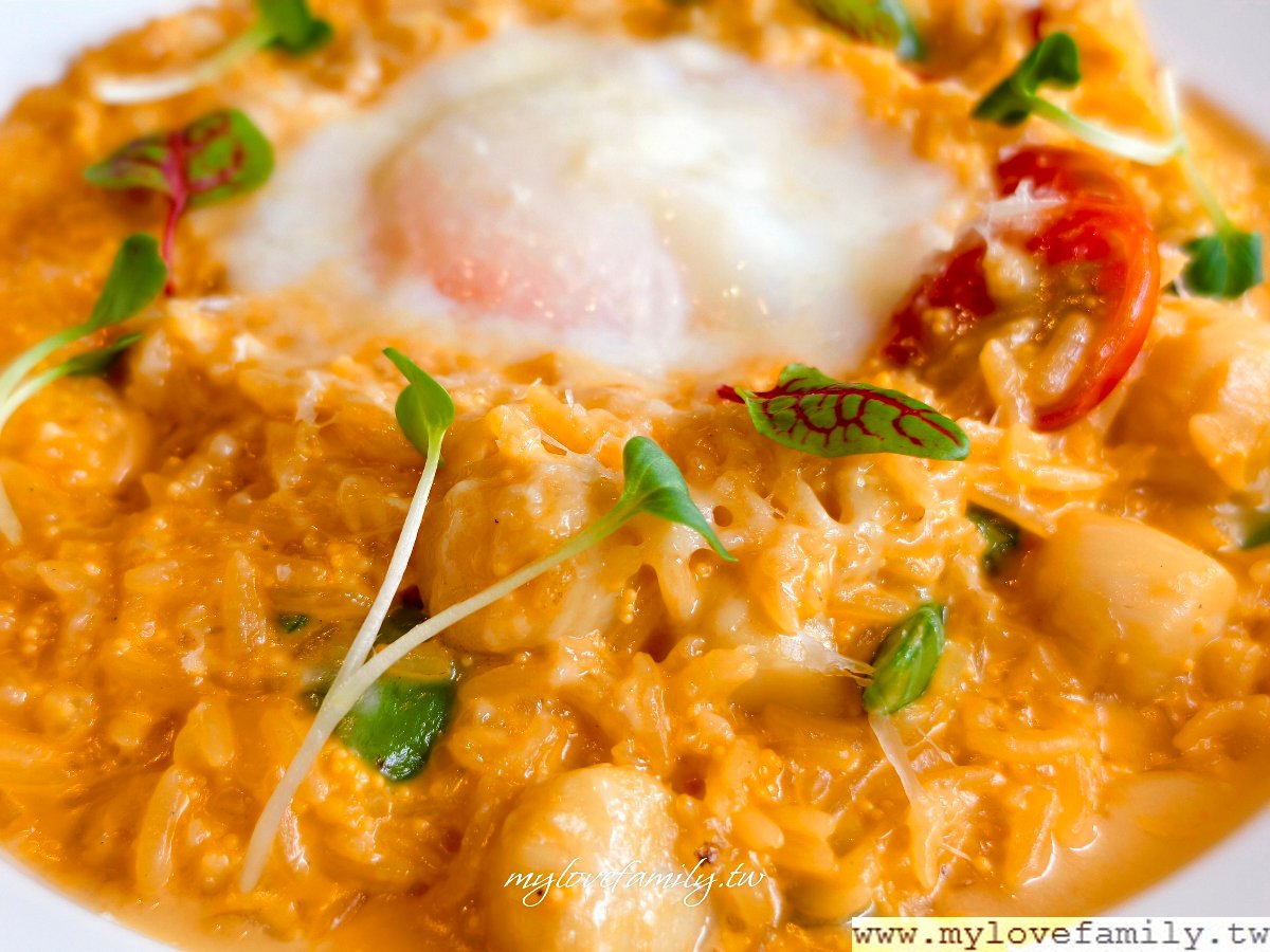 宥宥的海膽魚卵干貝燉飯+溫泉蛋,干貝的份量超大,我有試了一口燉飯米粒剛剛好,搭配上滑順濃郁的海膽魚卵、Q彈的干貝,很有層次感的料理。