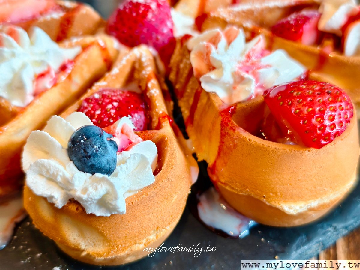 外酥內Q的草莓麻糬鬆餅,加上酸甜的草莓及藍莓,搭著美式咖啡很對味。