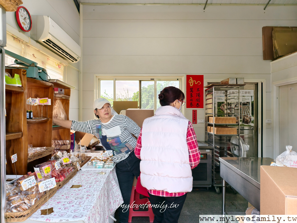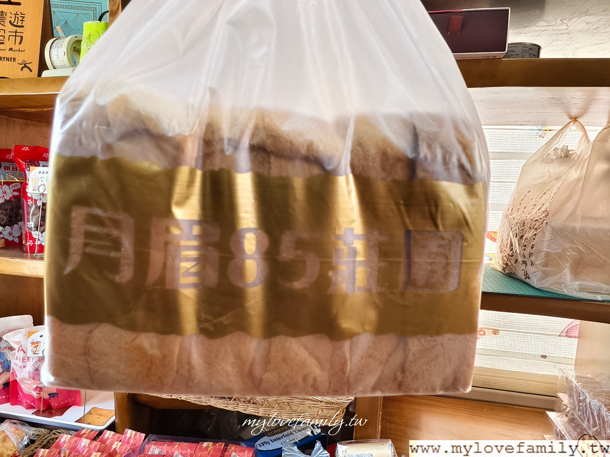 花田旁的【月眉85莊園】,連招牌都不明顯,如此低調的烘焙小店,怎會有不少客人都是電話預定專程從台北而來呢?google【月眉85莊園】資訊,原來,老闆李汪熙師傅是台北市知名的「凱樂烘焙坊」的業主之一,退休後,回到大溪月眉農村,李師傅運用當地食材製作出美味的麵包和糕餅,不少跟我們一樣來這旅行的旅人們,買過【月眉85莊園】的吐司後,嘴巴就黏住了。