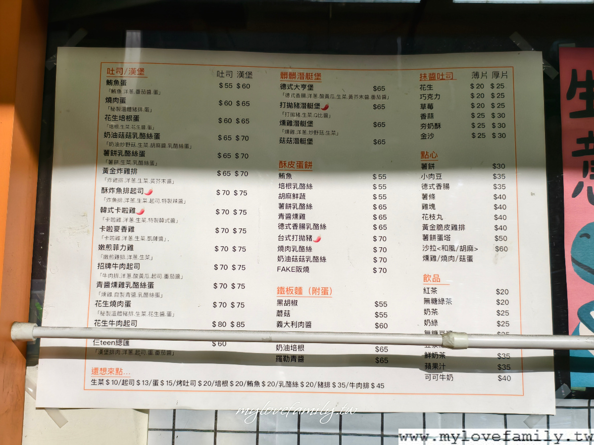 菜單,我一度以為自己眼花了,這價格太親民了,沒想到藝文特區內有如些平價的早餐點,加上選擇性好多,吐司/漢堡/潛艇堡/酥皮蛋餅/抺醬吐司/厚片/點心/鐵板麵/飲品樣樣有,唯一美中不足的是飲品沒有咖啡。