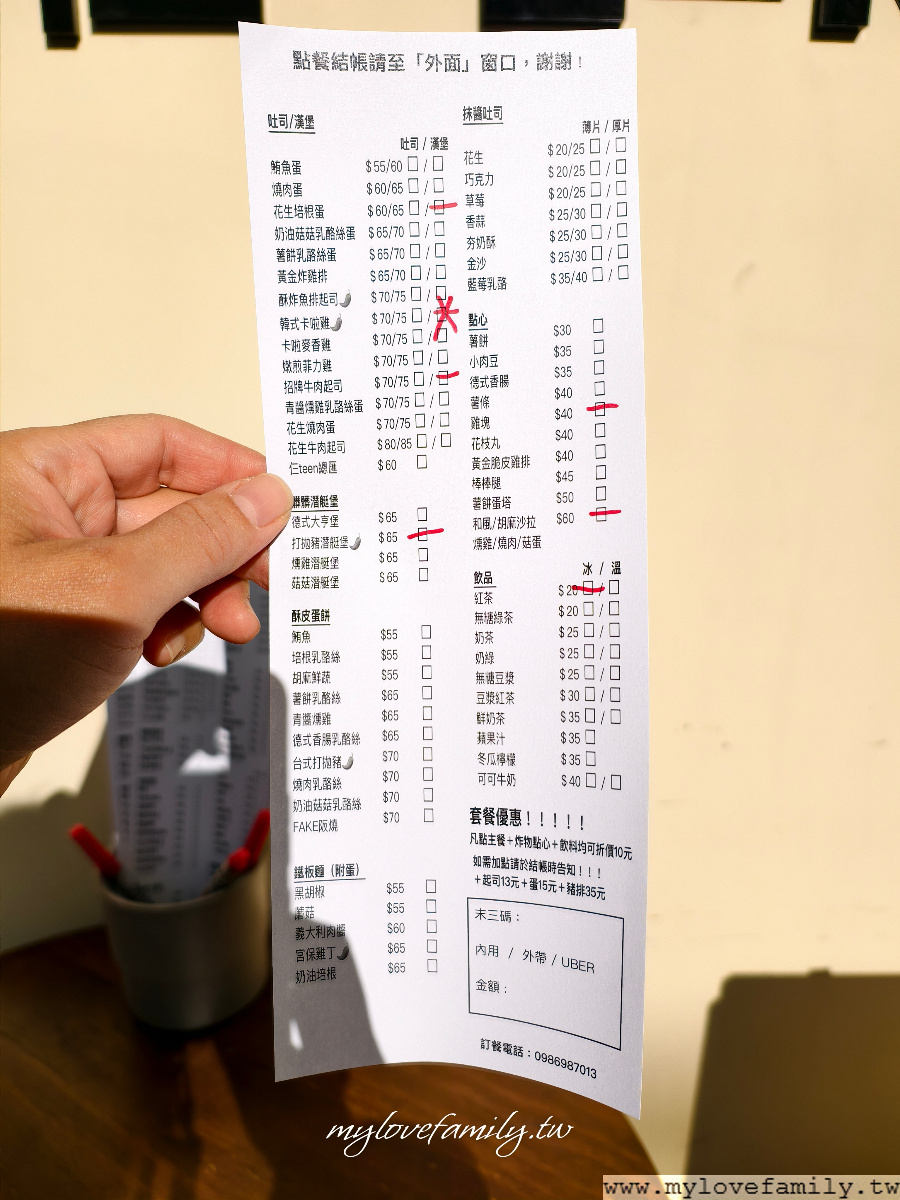 無論內用或外帶,皆需在窗口點餐。如同時點了主餐+炸物/點心+飲品,可折價十元。以下畫線的是當天點的餐點,總計$315元。