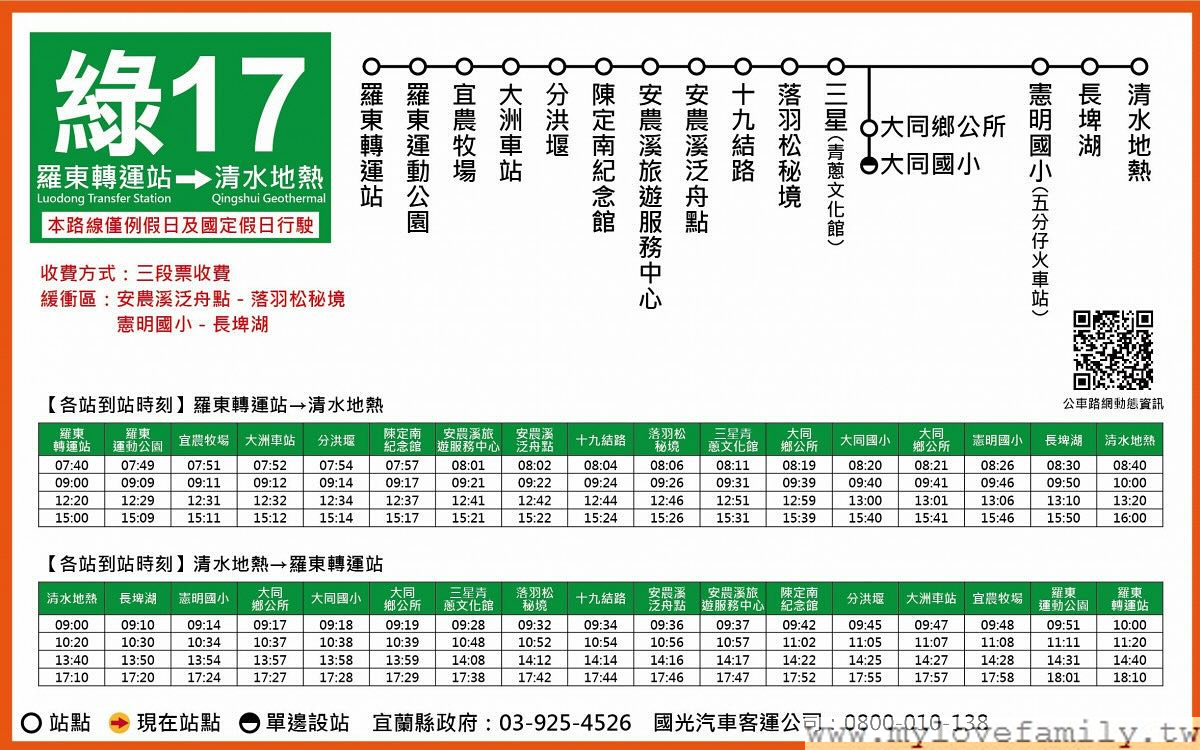 冬季週末限定公車,11月到明年3月的例假日,都有綠17以及接駁車可以搭乘,每段次票價(現金)全票20元、半票10元,電子票證(可使用悠遊卡、一卡通、愛金卡)全票15元、學生票10元。