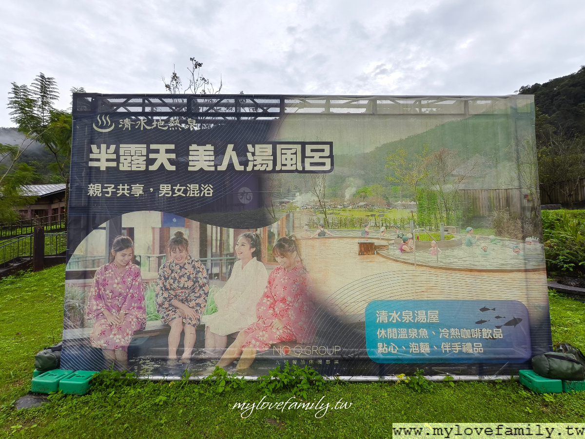 【清水泉湯屋】為宜蘭縣政府委外經營,正好就是我們當入住的【九號溫泉旅店】經營的企業,而門口雙邊的廉子上大大的寫個「九」字,簡單卻有代表性。