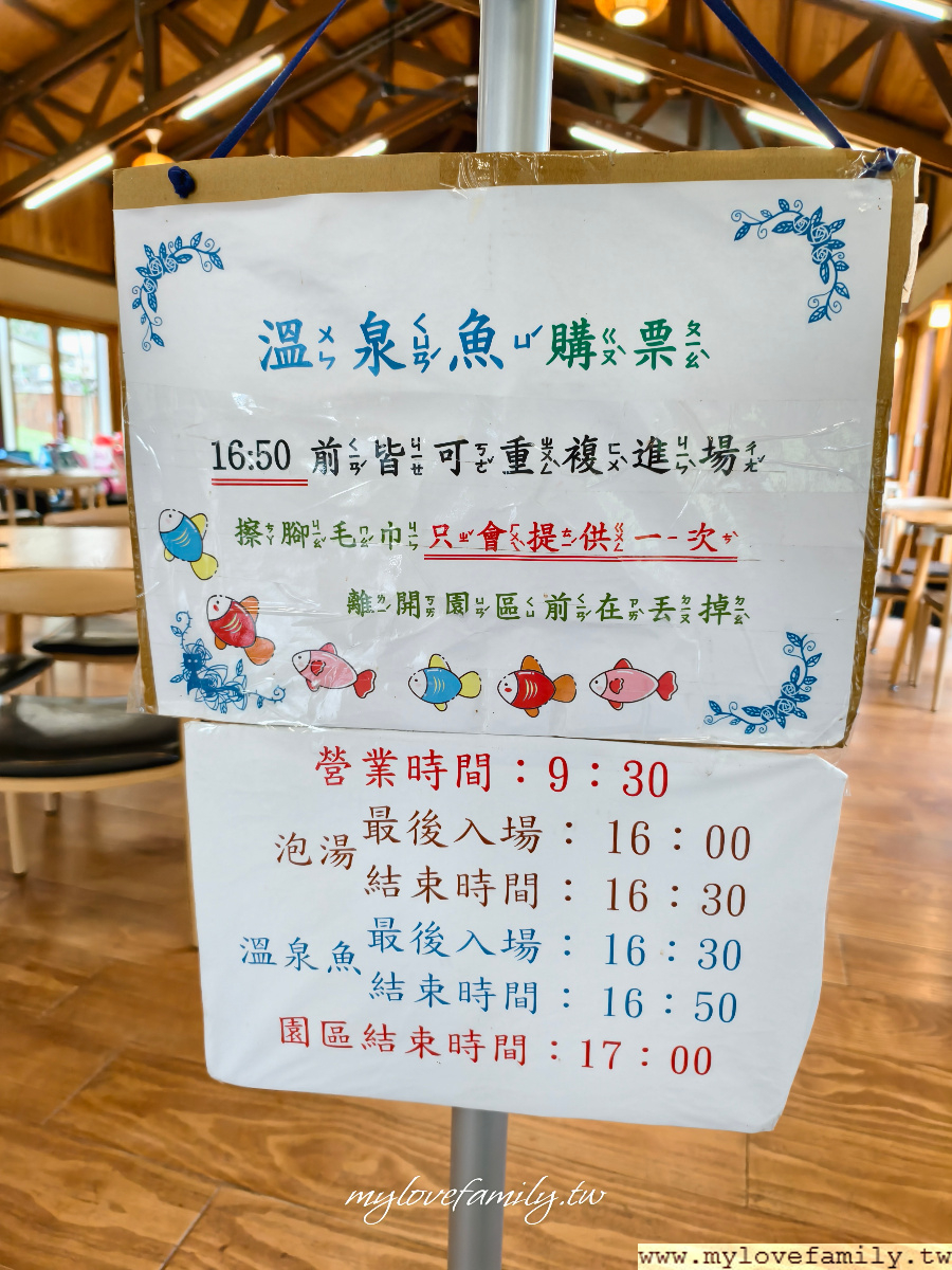 溫泉魚的部份,當天16:50前皆可重覆進場。泡湯營業時間:09:30~16:30(最後入場時間16:00),溫泉魚的部份,09:30~16:50(最後入場時間16:30)。