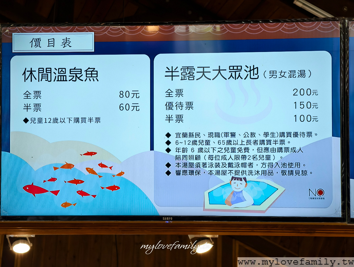泡湯收費方式,溫泉魚:全票$80元,半票$60元( 兒童12歲以下購買半票); 半露天大眾池:全票$200元,優待票$150元,半票$100元/宜蘭縣民、現職(軍警、公教、學生)可購買優待票,6~12歲兒童、65歲以上長者購買半票,6歲以下兒童免費,但應由購票成人陪同(每位成人限帶2名兒童)。