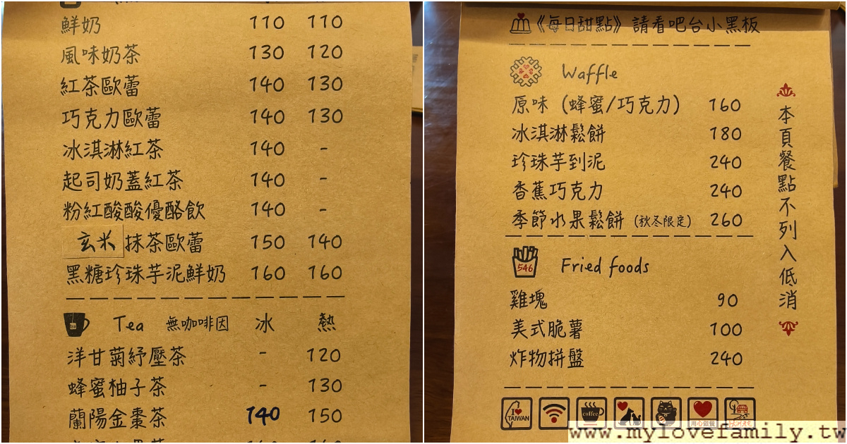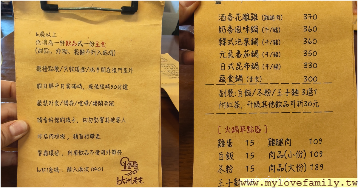 六歲以上低消為一杯飲品或一份主食(甜點、炸物、鬆餅不列入低消),菜單上有火鍋、咖哩飯、早午餐、甜點、飲品、炸物小點,最特別的就是鍋物的部份,鍋物還有附紅茶,如升級其他飲品可折$30元。