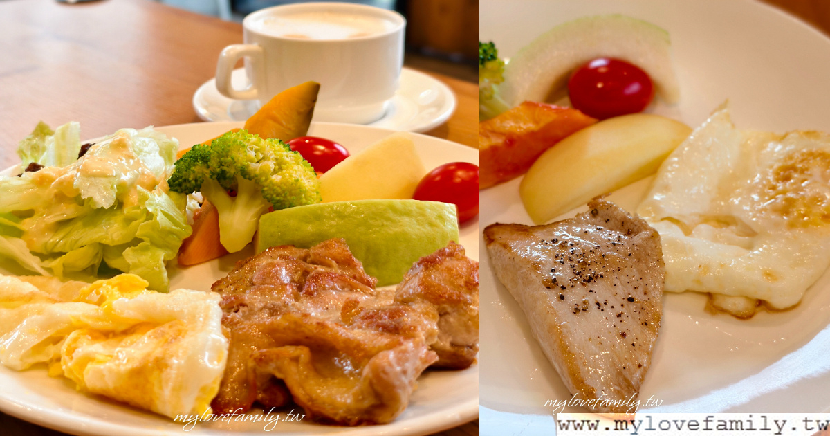 套餐有荷包蛋、生菜沙拉、雞腿排和水果,如吃不夠也能加點喔!