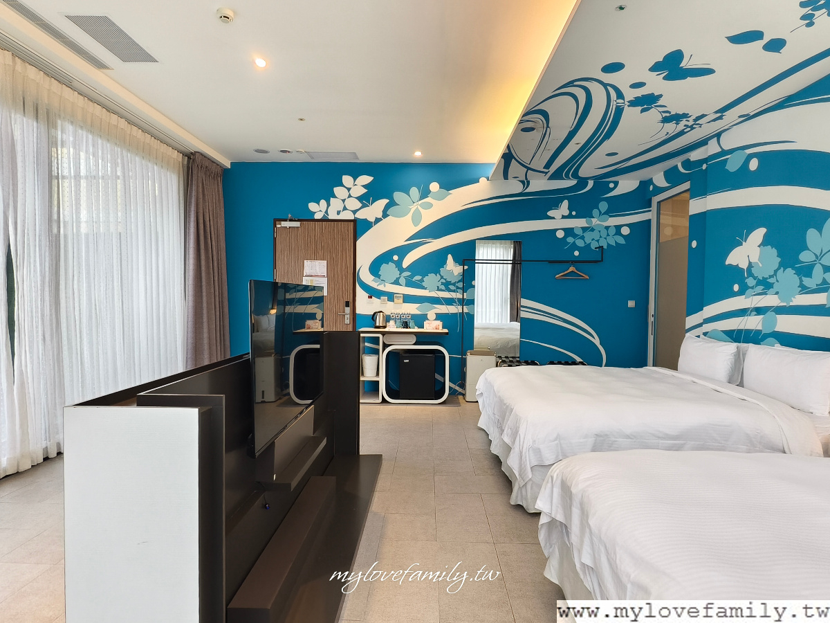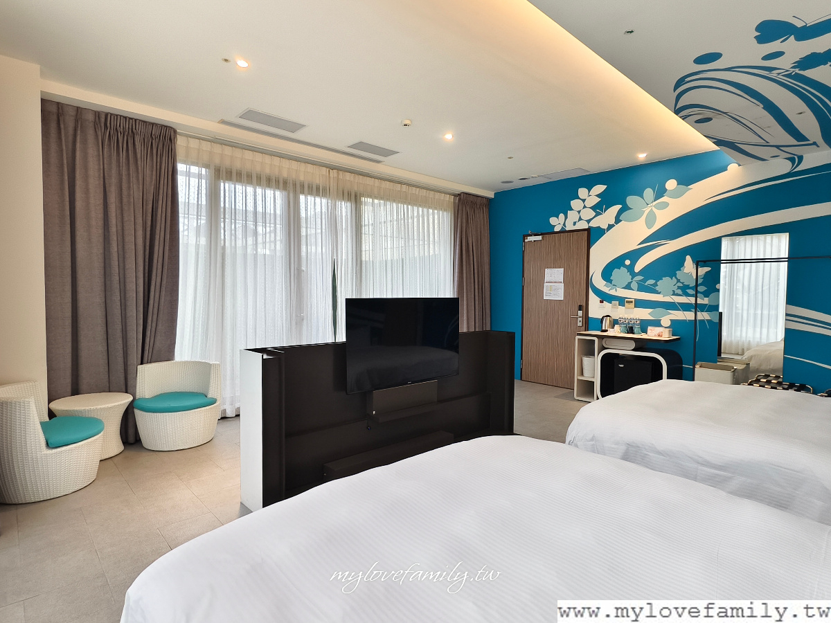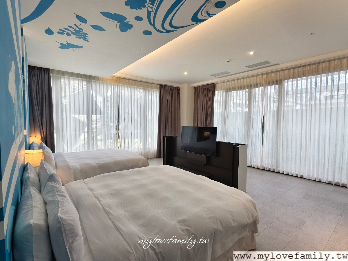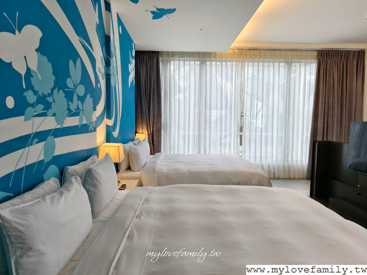 【九號溫泉旅店】共有3層樓、27間客房,提供多樣化的房型選擇,每間房都有超大空間之外,最驚艷的是每間客房都有超大泡湯池,泡湯池大到可以容納4~6人,完全是全家同樂的好空間。這次我們入住舞動藍蝶四人套房,擁有雙面落地採光,拉開遮光窗廉,讓整個空間好明亮。