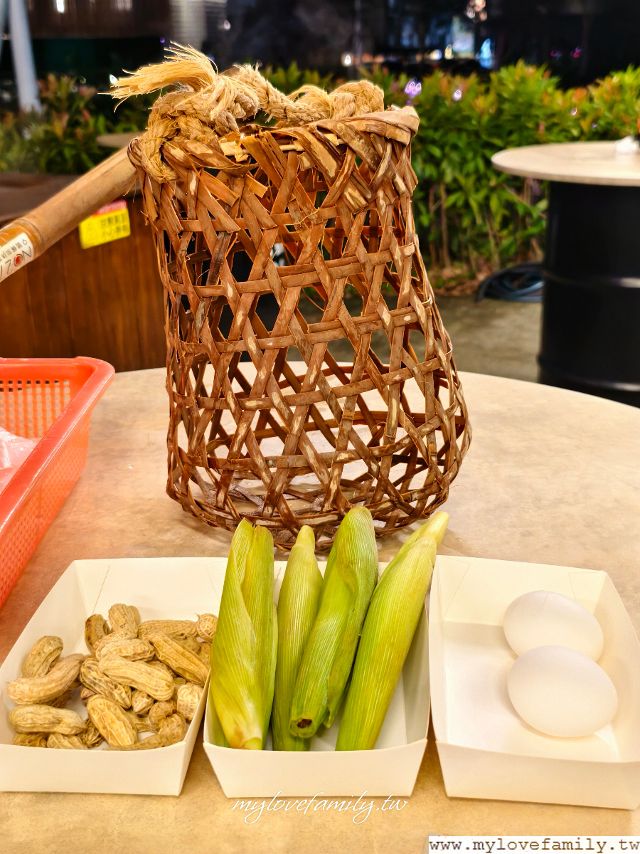 溫泉煮食套餐劵兌換到的組合如下,二顆雞蛋、一包花生及四根玉米筍。(入住提供的方案,以現場公告為主)
