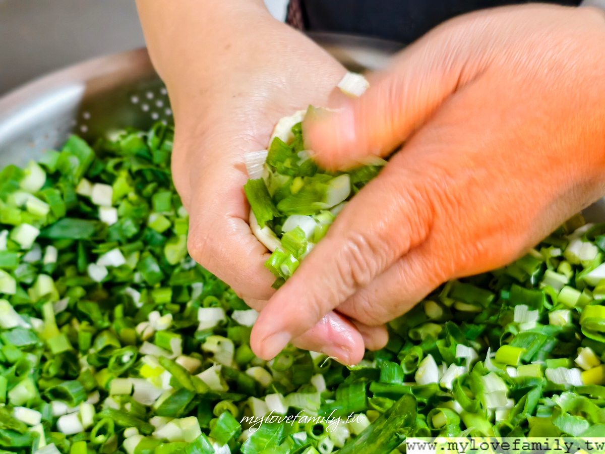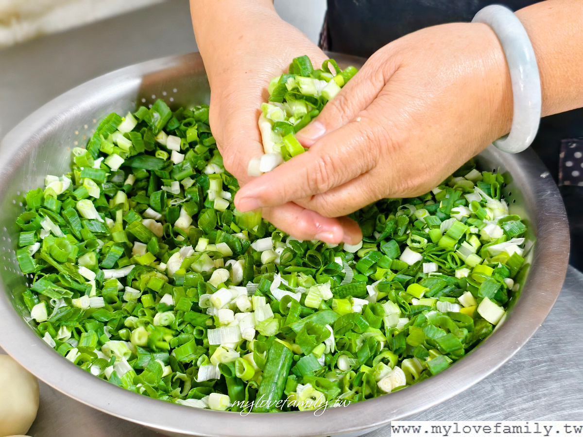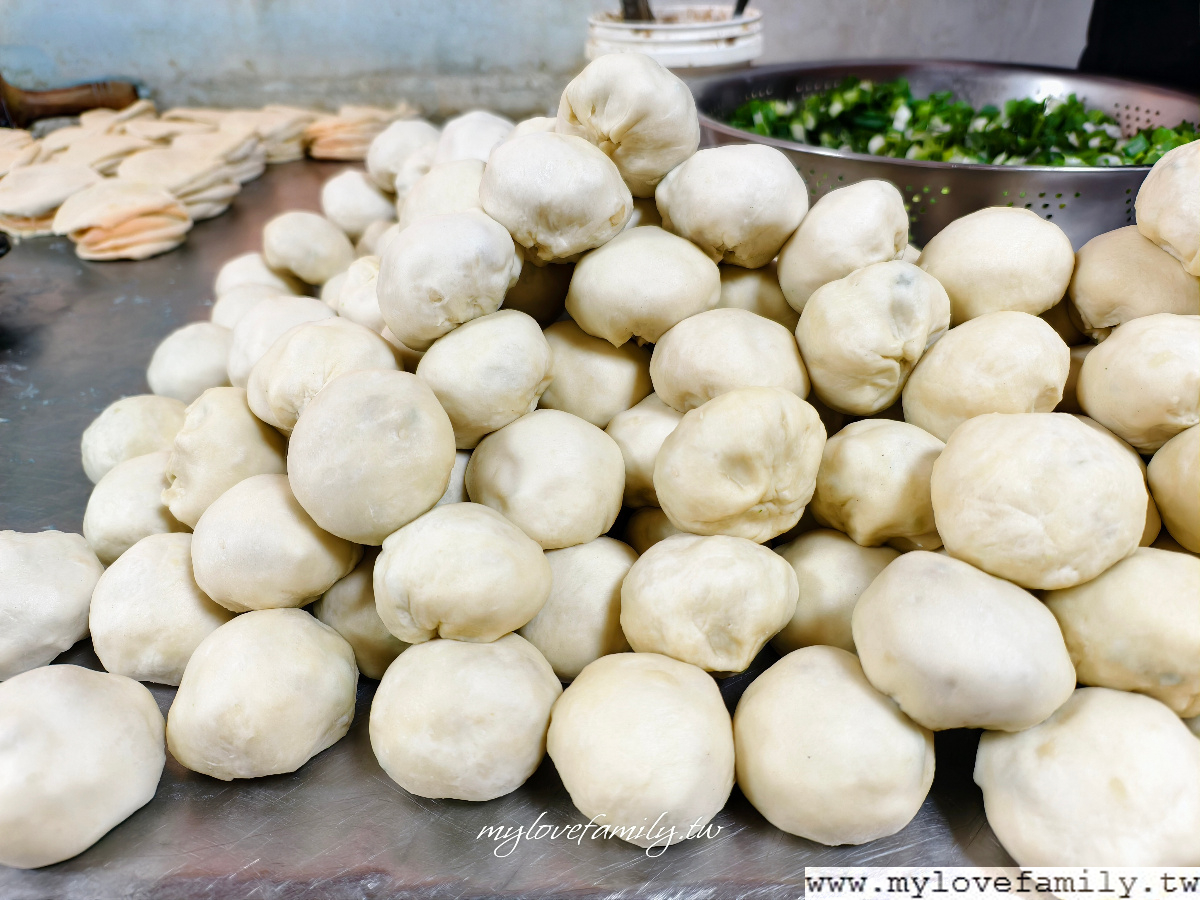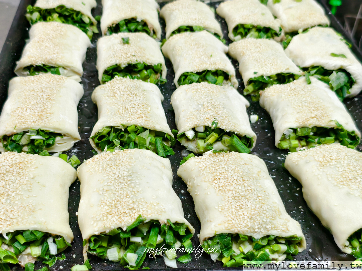 排隊等待的時間,詢問了闆娘可否先拍一下店內的製作過程?在闆娘同意下,進入拍了以下的照片。這蔥燒餅只要三十元,青蔥多到爆料的感覺,這內餡太豪邁了。