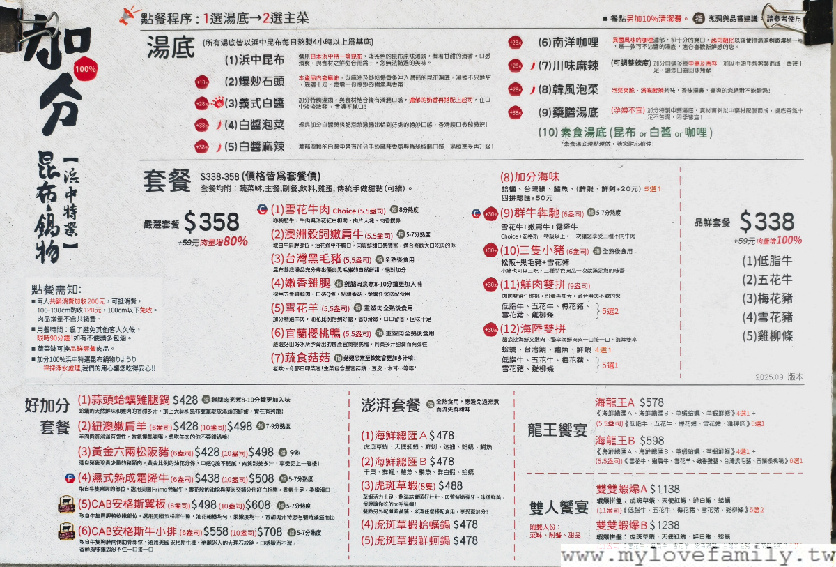 走進【加分100%浜中特選昆布鍋物-桃園大興店】前,先參考菜單,價格從338元起,湯底的部份,除了浜中昆布湯底不用加價之外,其他的湯底需加價18元~38元不等。