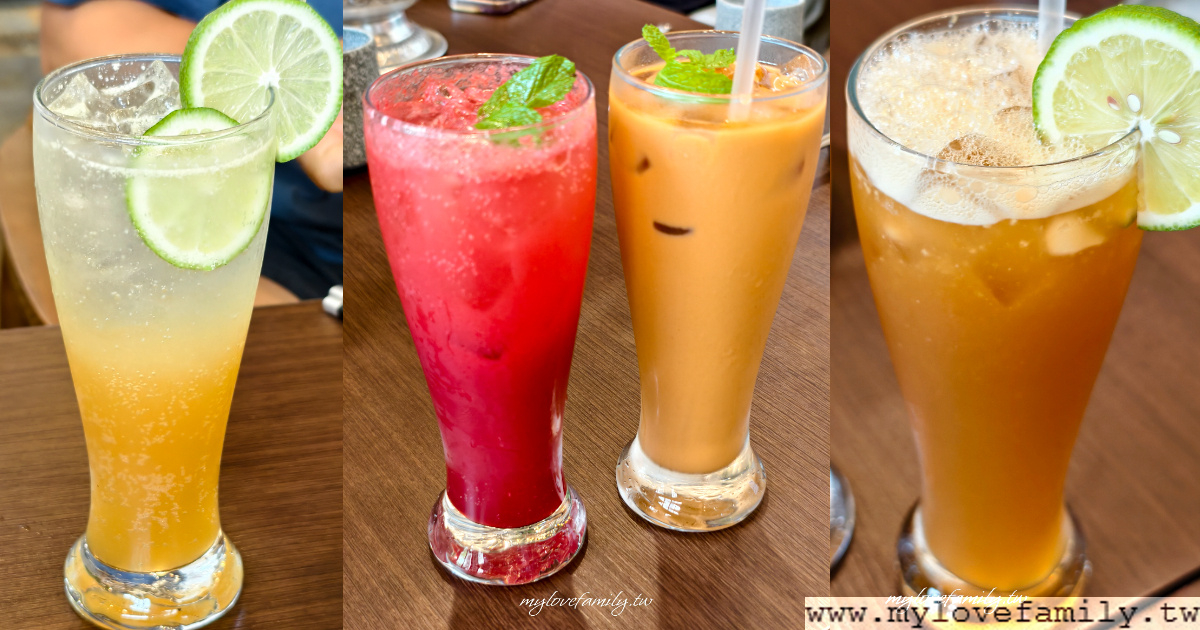 飲品的部份,我們點了四杯泰式奶茶、一杯檸檬紅茶、一杯蜂蜜檸檬氣泡飲、一杯覆盆子氣泡飲,我的覆盆子氣泡飲還不錯,濃郁莓果香氣加上氣泡水好對味。