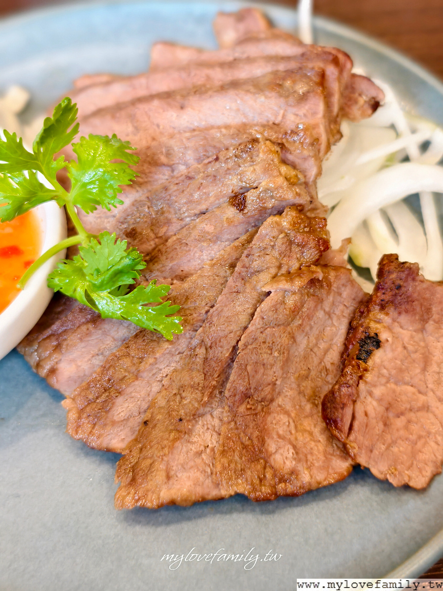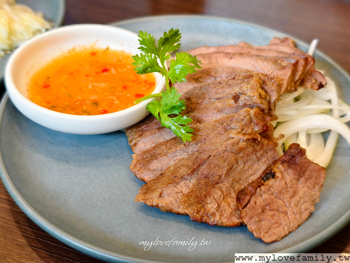 泰北嫩烤牛排428元,近拍這一盤,如看照片會以為很大,但並沒有喔!就是跟高麗菜一樣的盤子,一共切成十片,以酸辣香料沾醬來提味,肉質上沒有很細嫩,這一盤就有點普普。