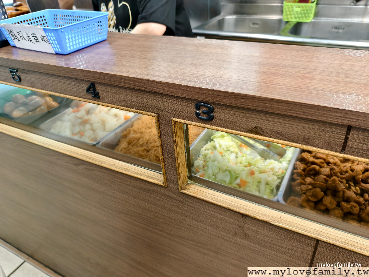 櫥櫃內是當天的配菜選項,滷蛋、蘿蔔、冬粉、高麗菜、麵輪、蒸蛋,以我們家愛葉菜類來說,真的只有高麗菜可以選擇,所以,三個便當選擇了高麗菜二份加一份蒸蛋。