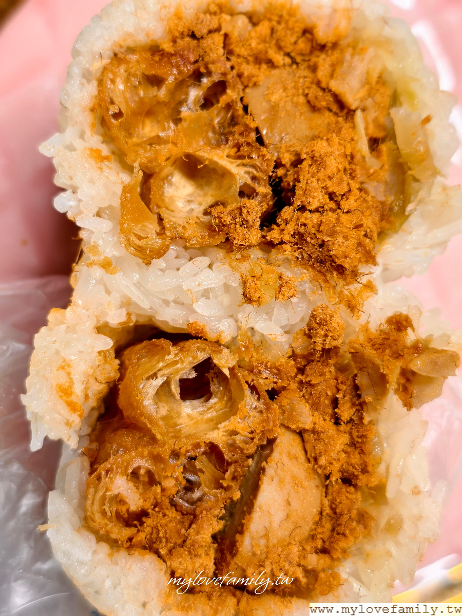 【那個飯糰】選擇性多,海苔芝麻飯糰、素食飯糰、肉鬆飯糰、海苔肉鬆飯糰、肉燥飯糰、控肉飯糰、魚鬆飯糰、榨菜肉絲飯糰,還可加$5元加蛋,或加十元加起司,另外,好胃口的朋友也可加價十元飯糰加大喔!來看一下配料吧!油條可不是碎碎的喔!油亮亮的控肉,這可是我們家戶長的最愛口味。(好可惜目前控肉已停賣)