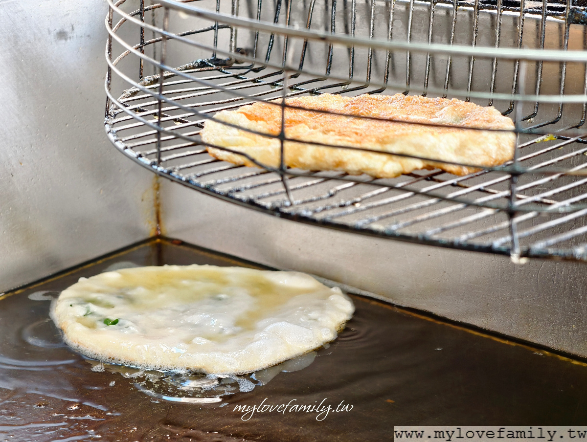 看起來白白的麵團內,張開後就可以看到蔥花,還有看不見很隱藏的肉末喔!在擀麵團的同時,油油亮亮的餅皮,放入油鍋後,滋滋作響的油聲,香味四溢。