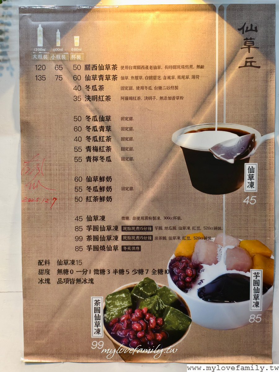 【仙草丘】品項很單純,以仙草為主,另外還有明目菊花茶、決明紅茶、冬瓜茶、芋圓仙草凍等等,全部都由店家自行料理,天然的飲品及甜點,給家人們吃好安心。
