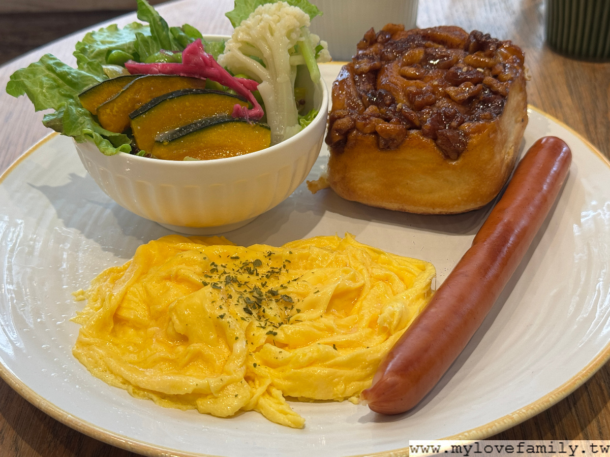 閨蜜說來到【Miss V Bakery Cafe 赤峰店】一定要點肉桂捲,還好點早午餐的吐司可以加價升級肉桂捲/可頌/土耳其貝果/酸麵包,於是,我點的週間限定早午餐Little V Breakfast就加價換肉桂捲。