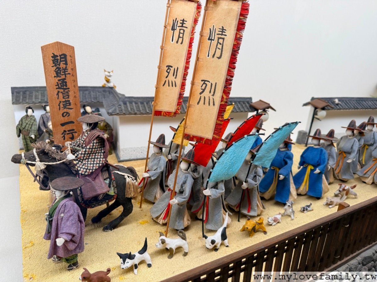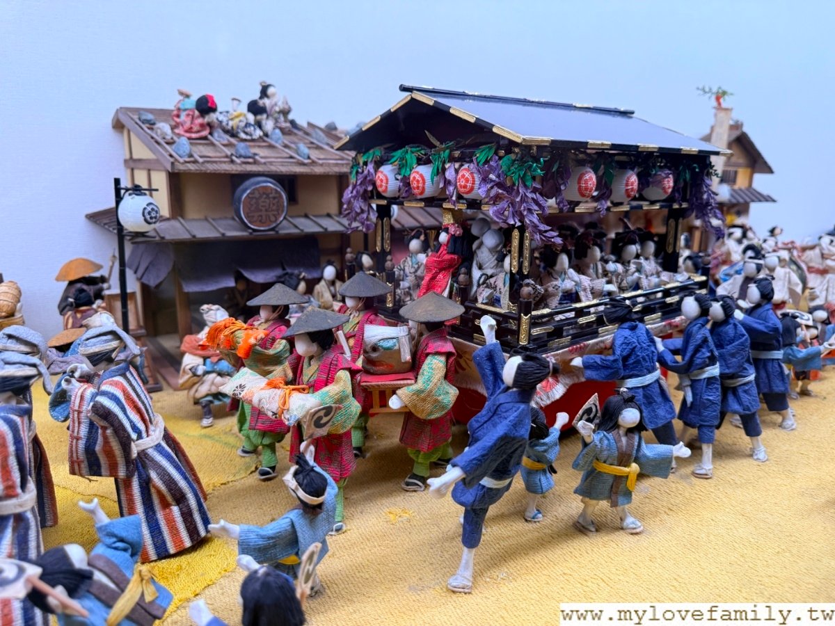 城下町風貌再現:小模型呈現了當時的街道熱鬧景象,有武士行列、抬轎隊伍,以及民眾的生活氛圍,甚至還有貓狗等小動物,細節非常生動。