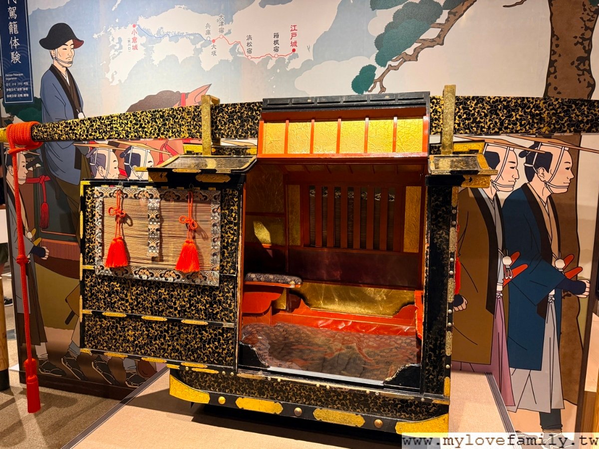 大名轎子:最後一張則展示了精緻華麗的「駕籠」(轎子),是當年武士階級或大名專用的交通工具,金箔與漆工藝彰顯身份與威嚴。
