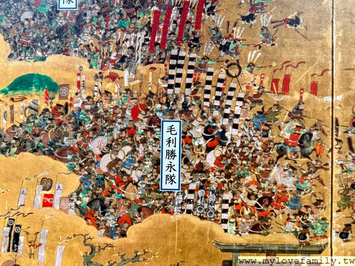 戰國合戰圖:第三張展示的是毛利與對手的激烈戰鬥場景,色彩鮮豔、細節繁多,重現戰國時代的壯烈場面。