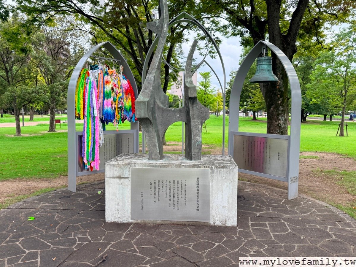 勝山公園 長崎の鐘(原爆犠牲者慰霊平和祈念碑) : 一座和平紀念碑與和平之鐘,旁邊掛滿象徵祝福與祈願的千羽鶴。這裡靜謐莊嚴,傳達了對和平的祈望與歷史的省思。