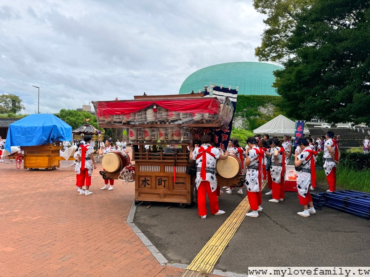 北九州市立文學館前,看到身穿傳統服飾的表演隊伍,伴隨太鼓聲與花車遊行,熱鬧非凡,這是當地祭典的重要特色,展現了北九州濃厚的庶民文化與傳統延續。