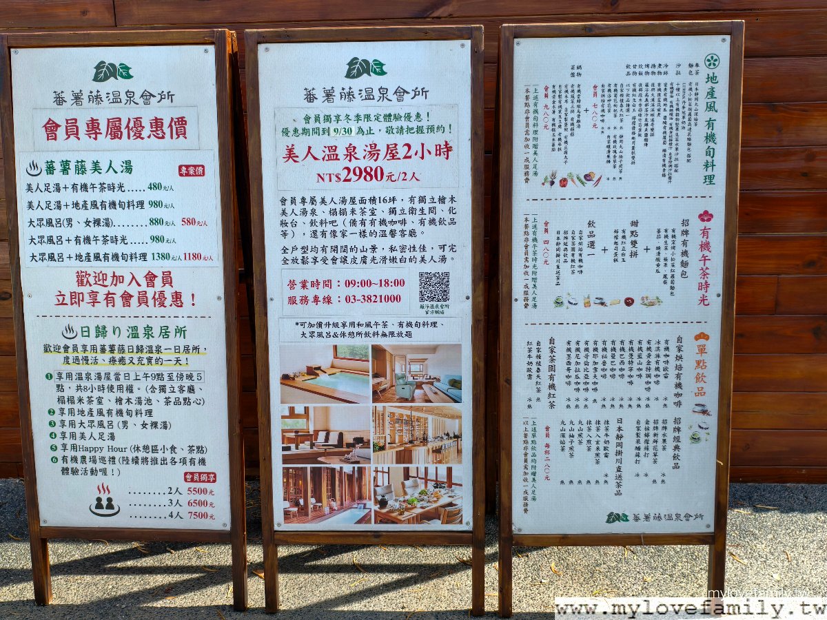 當下才認真研究消費方式,【蕃薯藤羅浮溫泉會所】包含全新型態的『日歸り湯屋居所』、大眾天然溫泉風呂、美人足湯,及泡完溫泉後的休憩區。我們選擇了可八小時無限使用使用溫泉湯屋、 每位享地產風有機旬料理(如單獨享受此料理,每人收費$980元)、大眾風呂、美人足湯、Happy Hour飲品無限享用的休憩區的18坪溫泉湯屋『日歸り湯屋居所』。收費方式:7500元可供兩位成人使用,每增加一位成人加收$1000元、兒童115-150cm 加收$500元、115cm以下免費。以我們一家四口為例,等於計價$9500元,含四位的無菜單料理及8小時的湯屋等無限使用,平均下來,每人計價$2375元,如扣除每人餐費$980元後,等於每人收費$1395元就能使用八小時的無限使用湯屋等服務,對於精打細算的我而言,這收費方式不貴啊!於是,提前預訂了18坪溫泉湯屋『日歸り湯屋居所』,跟著我們來去看看【蕃薯藤羅浮溫泉會所】。