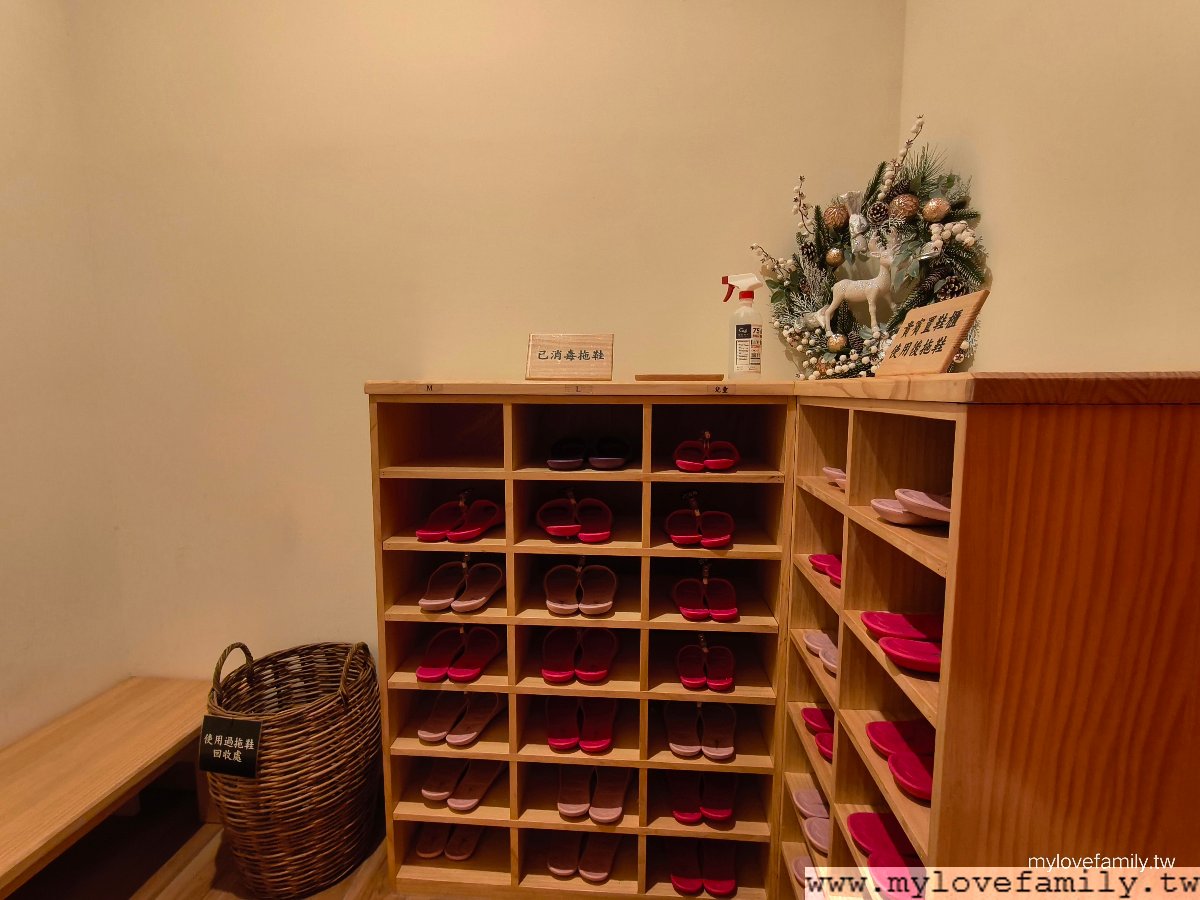 走進女大眾裸湯,入口處放置已消毒拖鞋,在此先換下自己的鞋子,換上拖鞋後,再進入置物區。