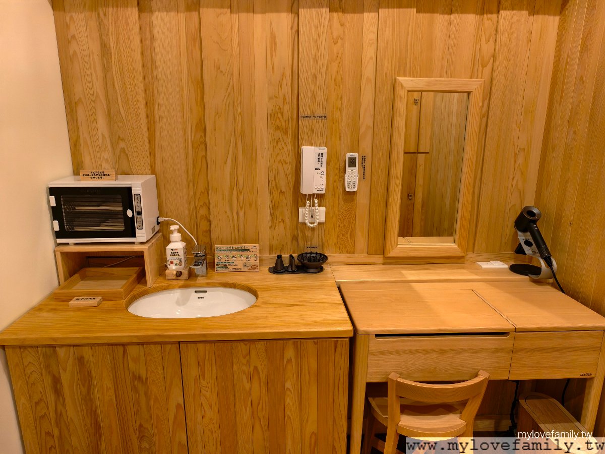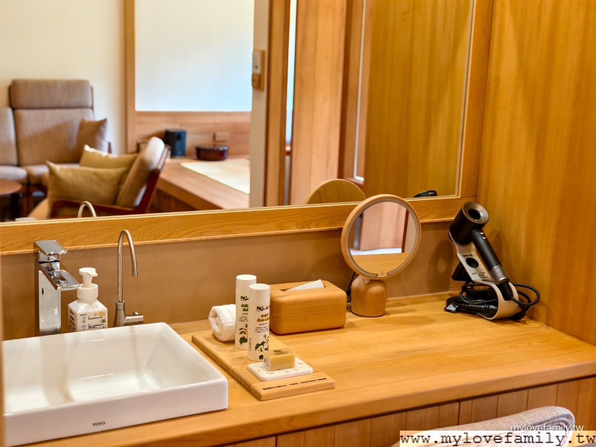 梳妝台空間,每一處都能看見【蕃薯藤羅浮溫泉會所】的用心,備品的規格可說已經超越不少日式溫泉會館,掀式抽屜內有化妝水、乳液、有機化妝棉、棉花棒、紙巾、髮圈、梳子。吹風機更是提供 Dyson 的吹風機,為提倡環保不提供一次性的梳子,使用過的梳子服務人會都會放進消毒箱中。