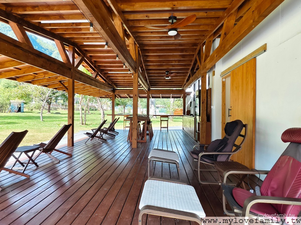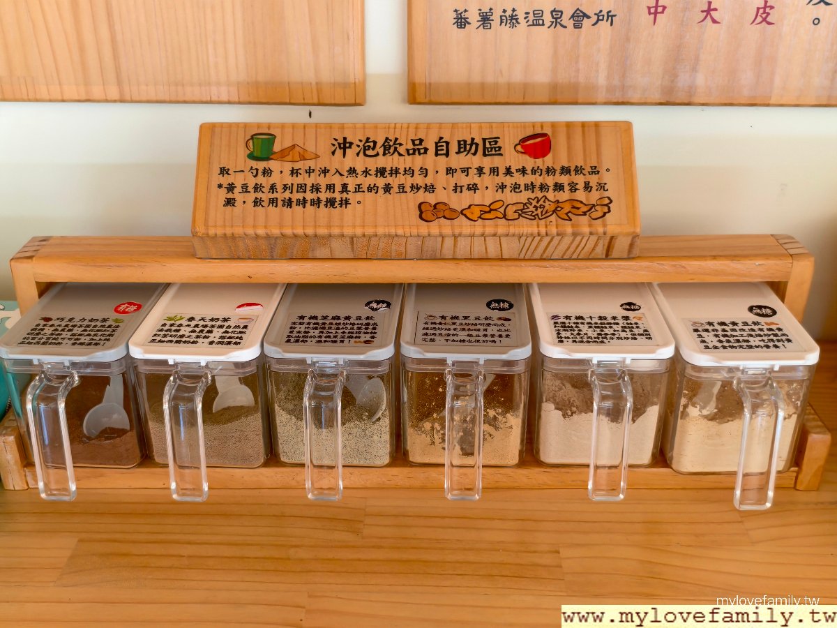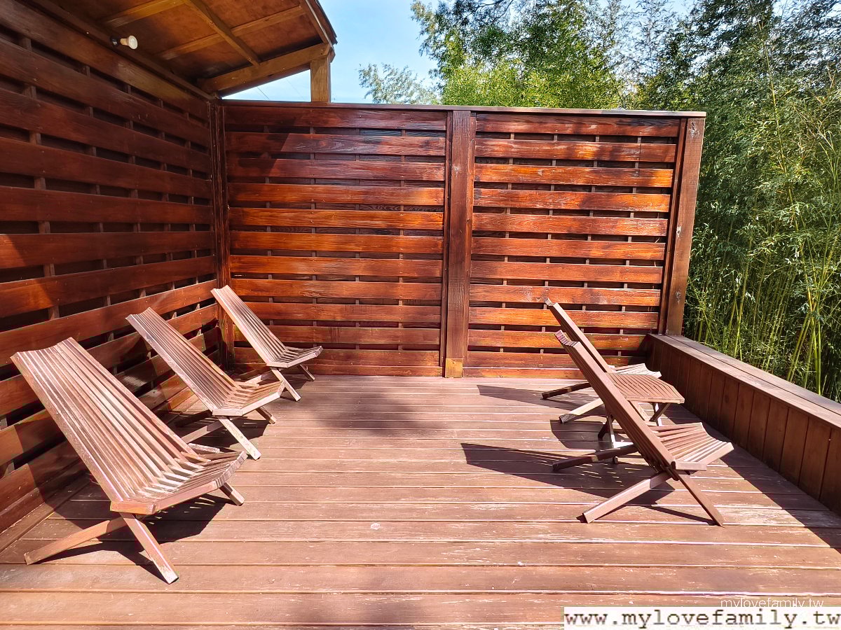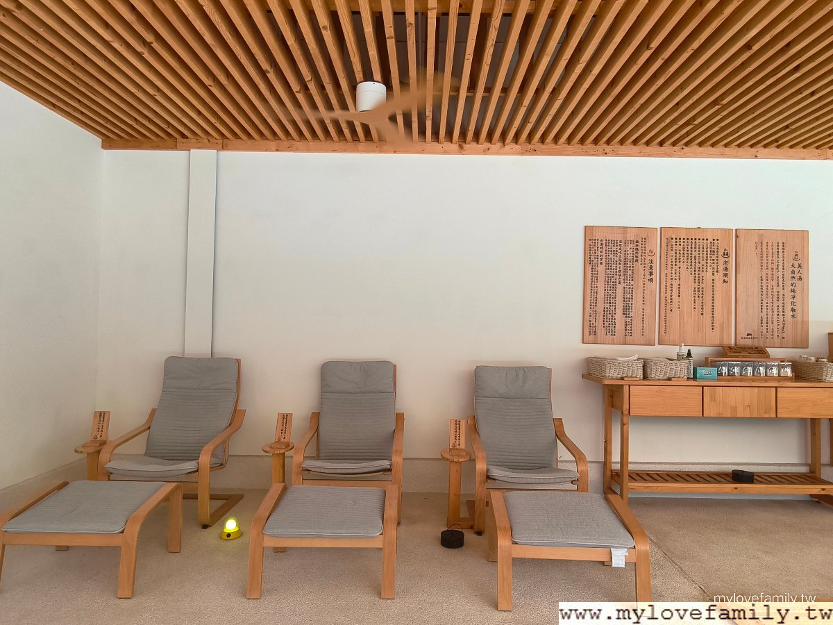 休息椅區,泡溫泉要量力而為喔!5~10分鐘起身休息一下,喝杯水或給自沖泡一杯熱的穀物飲品、奶茶補充一點體力,再進入泡湯池。