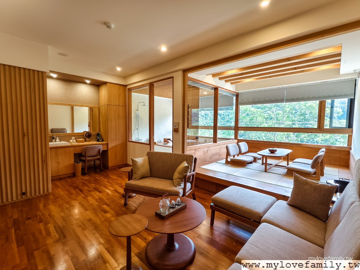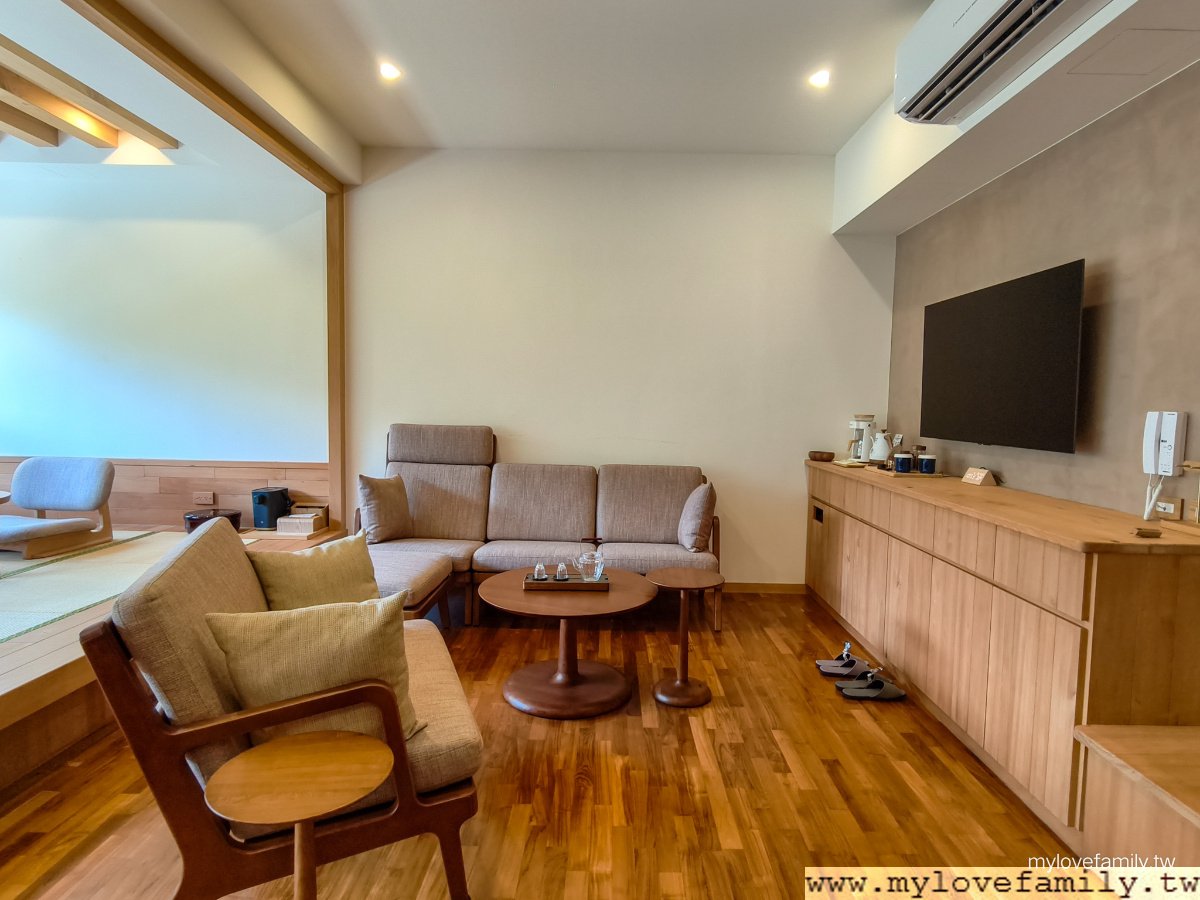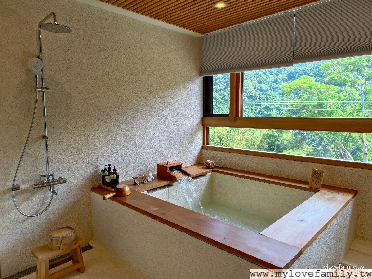 擁有山景的 18坪溫泉湯屋 ,我家青少年一進入後好興奮,二兄弟一直說:有木頭的味道,這好高級。每一間都有寬敞溫泉池,還有日式榻榻米空間、客廳、獨立廁所與梳妝台,一家四口能在同一空間內,輪流泡溫泉之外,給自己沖一杯咖啡或放鬆茶,享用免費的零食,各自能做自己喜歡的事情,二兄弟一下子打電動,一下子唸書、做設計作品,我及戶長則是各自看著影片,時而望著山林,來到這不止是泡湯,而是一起享樂。