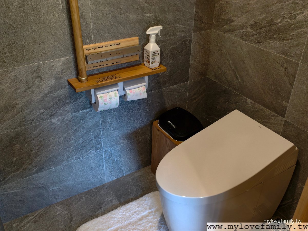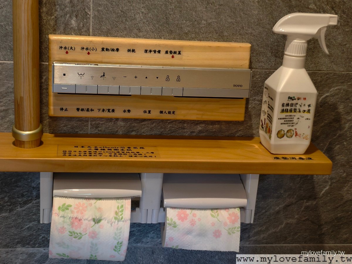 TOTO免治馬桶,而一旁的衝生紙及放置酒精平台,一體成型的多了扶手設計,對於家中有行動退化的長輩而言,這貼心的扶手會讓我覺得感動。