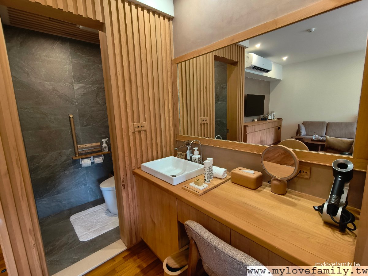 廁所與梳妝台空間,這的細膩度,會讓我覺得這錢花的很值得。一樣同大眾池的備品,化妝水、乳液、有機化妝棉、棉花棒、紙巾、髮圈、梳子、 Dyson 的吹風機。特別一提,蕃薯藤品牌的控油化妝水、控油乳液超好用,尤其當天早上及下午各泡一次溫泉,泡湯後保濕好重要,而這的控油化妝水、控油乳液擦完後,能明顯的感覺到保濕度喔!所以,當天回家前買了一罐回家,持會員卡打95折,打折後,一罐只要$371元,這大概是我買過最便宜的保養品了。