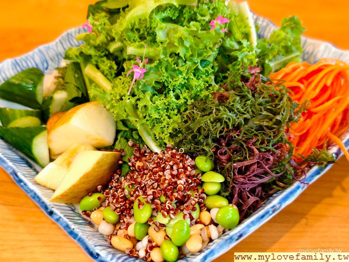 有機生菜沙拉盤,綜合萵苣、芝麻葉、紅蘿蔔、小黃瓜、毛豆、蘋果、紅藜麥等十幾種綜合蔬菜與堅果穀物,吃美味也吃健康。