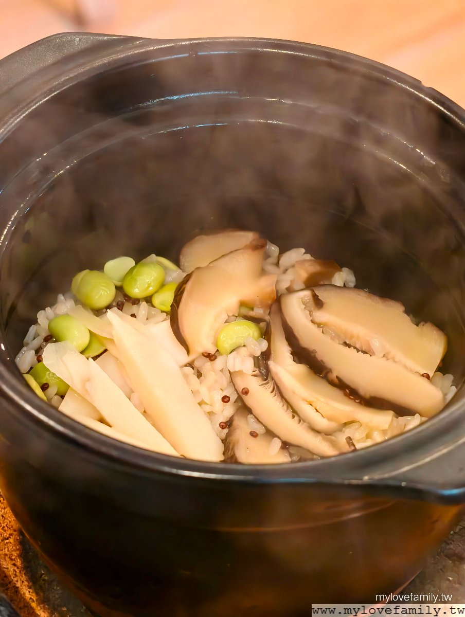 「炊飯」使用復興在地椴木香菇與綠竹筍,另外加上毛豆及紅黎,看似很簡單的料理,沒想到味道超棒。