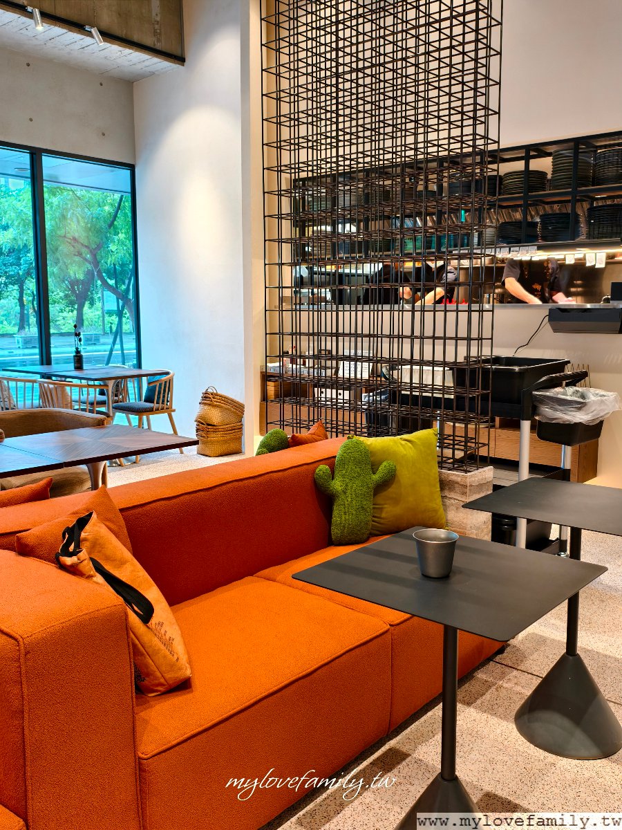 【浮島風禾】的內部色系,由【Söt Café rivulet. 浮島溪】延伸相同色系,除了原有的清水漠模搭著木造元素+橘紅色沙發椅區之外,這回多了穿透性的金屬網格來做為空間區隔,整個空間感給我的感覺是如同為這柔軟的空間,增添一份鋼鐵般的後盾。
