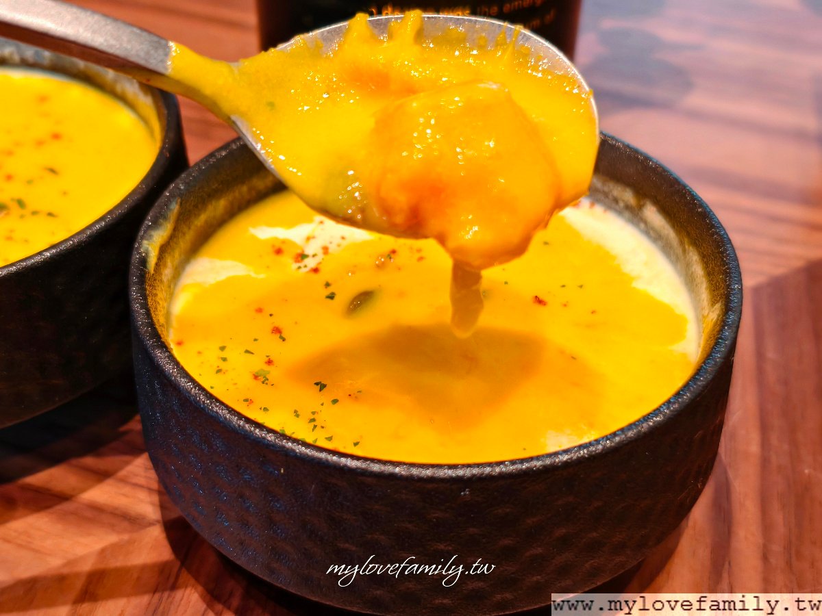 當天為南瓜濃湯,帶有南瓜的甜味及濃郁的香氣,還有喝到滑順的南瓜泥,我們喝到連一滴都不剩。