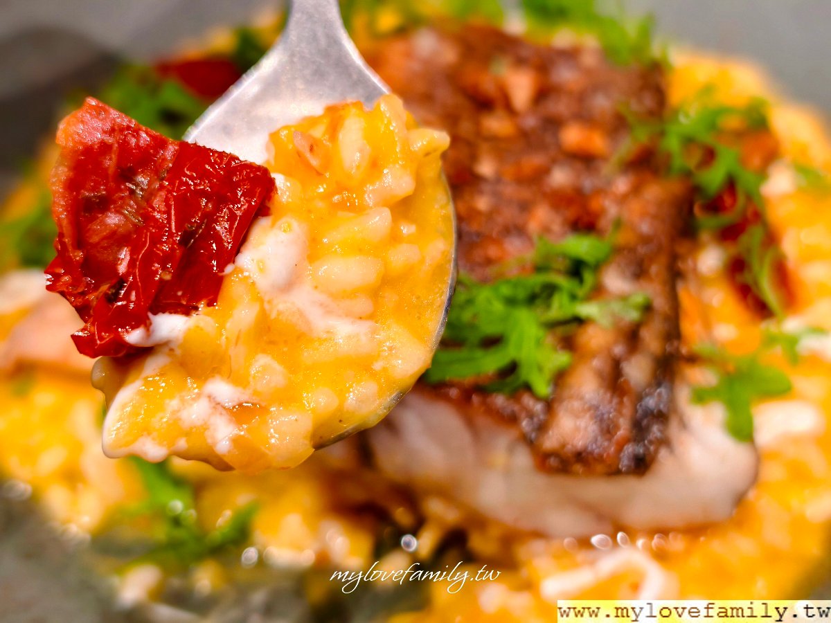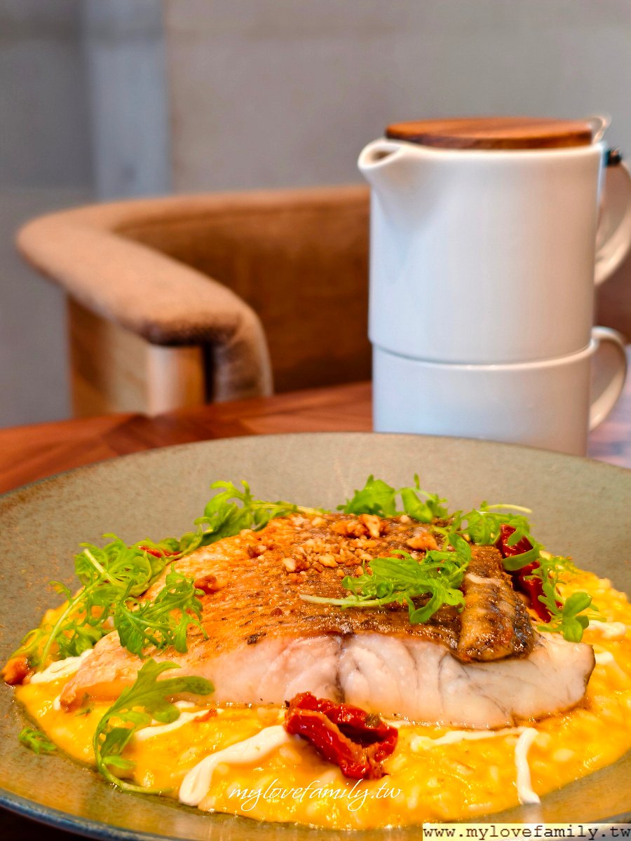 板煎鱸魚南瓜奶油燉飯,好厚實的板煎鱸魚,這一份不止美味,連擺盤都很講究。
