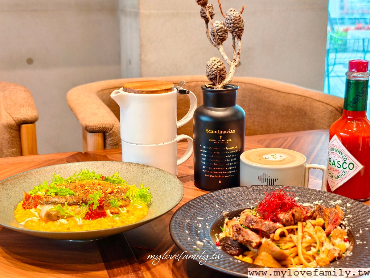 點主食加價$150元升級套餐(含濃湯及指定飲品),飲品也可以補差額更換,這次跟好姐妹共點了板煎鱸魚南瓜奶油燉飯、炙牛肉牛肝菌細扁麵、青花椒鹹豬肉胡麻沙拉、浮島草莓麻糬鬆餅,升級套餐的飲品,我們換成熱桂花拿鐵、花果茶,另點了藍莓優格果昔及奶油蕉糖脆拿鐵。